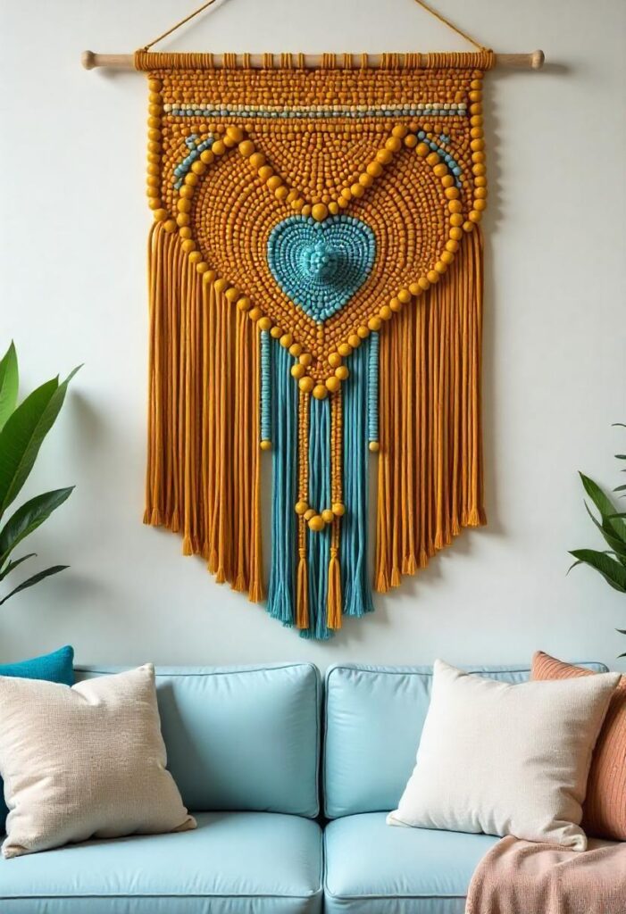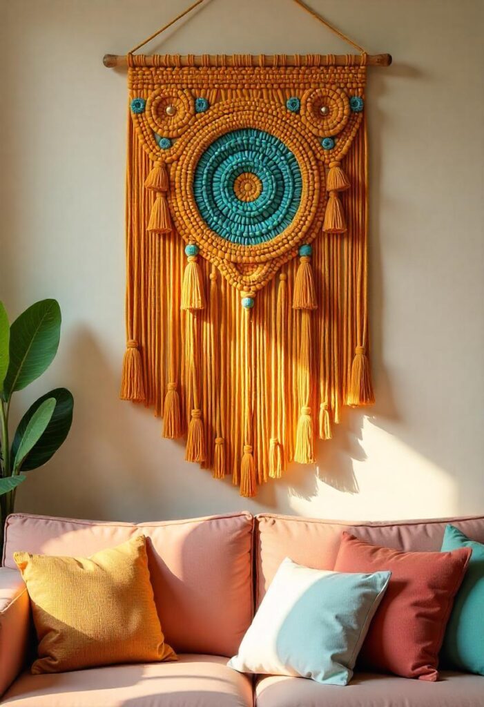 Macrame can be reimagined with bold yarns, added metallic threads, and layered knots. Install on a wooden dowel and combine both fine and thick cords. Choose thread colors that contrast with your wall for better visual separation. Gold beads or brass rings may be added for structure. These pieces are often hung above low furniture. Keep the size proportional to the wall area for balance.