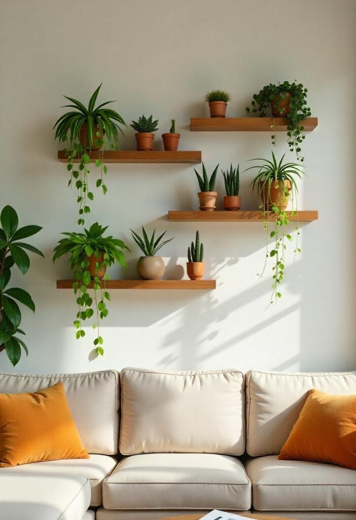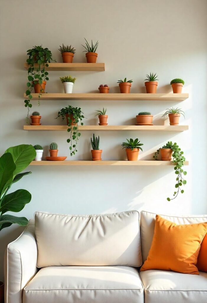 Floating wooden shelves fixed to the wall can double as display zones for small plants. Vary the height and spacing to avoid repetition. Opt for compact greenery like succulents or vines that drape down over the edges. Using uniform pots enhances visual clarity. Select wall anchors based on the weight of your planters. This setup works well on feature walls or between windows.