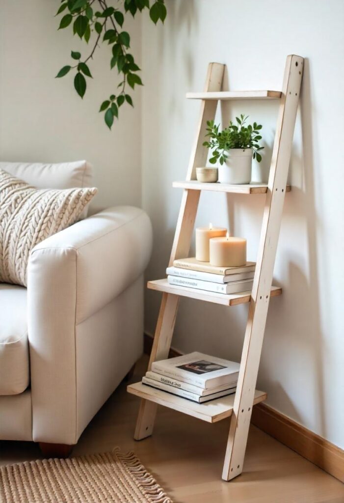 Old ladders can be transformed into multipurpose side tables using minimal alterations. Clean, sand, and paint the frame to match your interior palette. Horizontal steps act as storage for books or decorative objects. Wall-stabilizing brackets ensure safety if leaned rather than freestanding. Choose a ladder height that aligns with adjacent seating. This solution works well in rooms with limited surface area.
