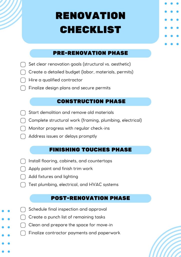 Create a home renovation plan checklist that includes these elements, and track their progress against the timeline. Make sure to check off items like design finalization, contractor selection, and permit approval as you go, ensuring the renovation stays on schedule.