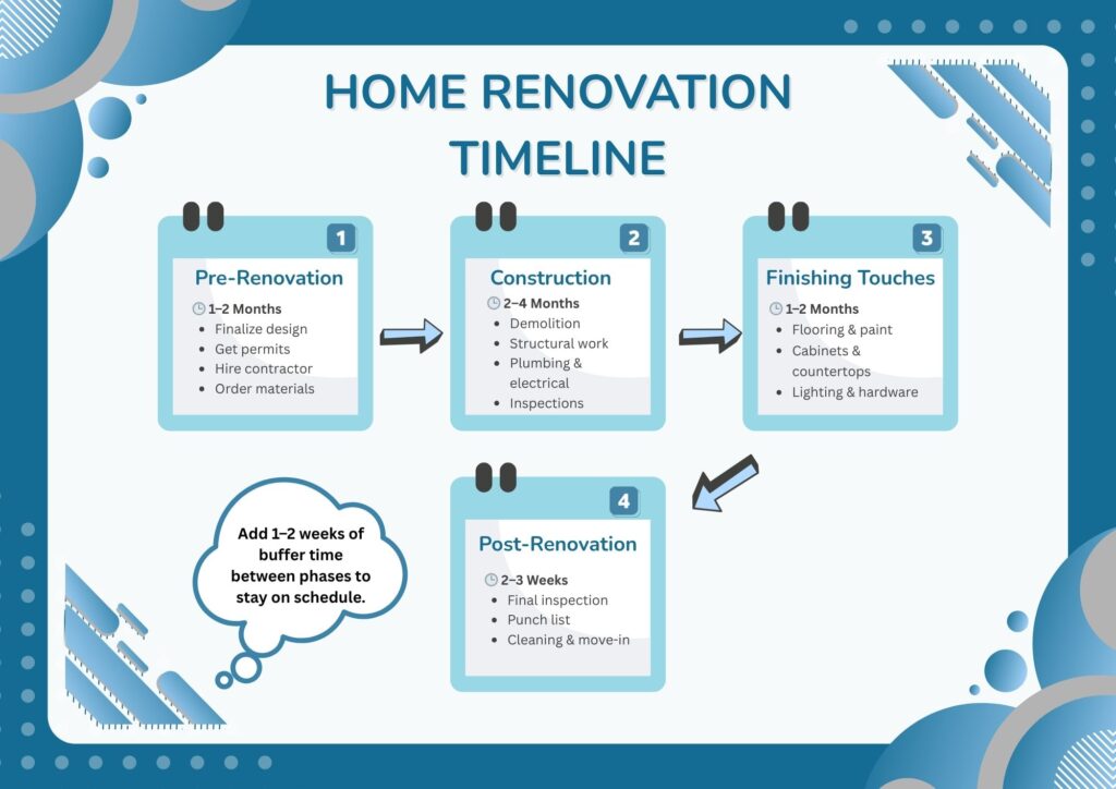 Always include time buffers in each phase of your timeline. Renovations rarely go exactly as planned, and delays due to contractor scheduling conflicts, material availability, or unexpected structural issues are common.
