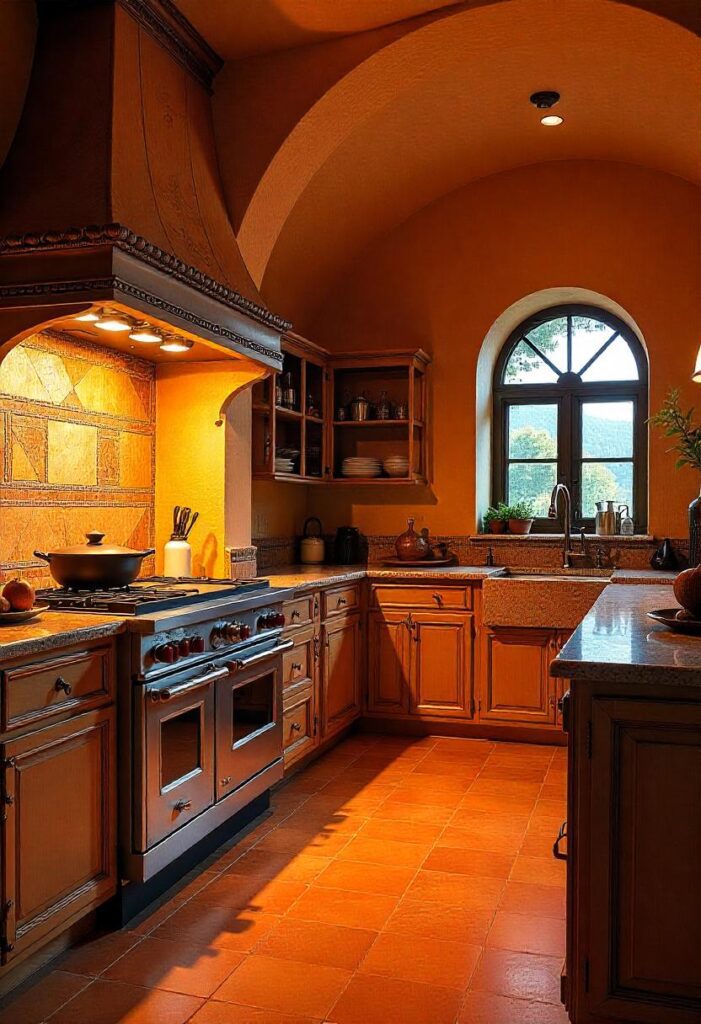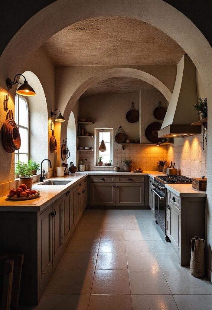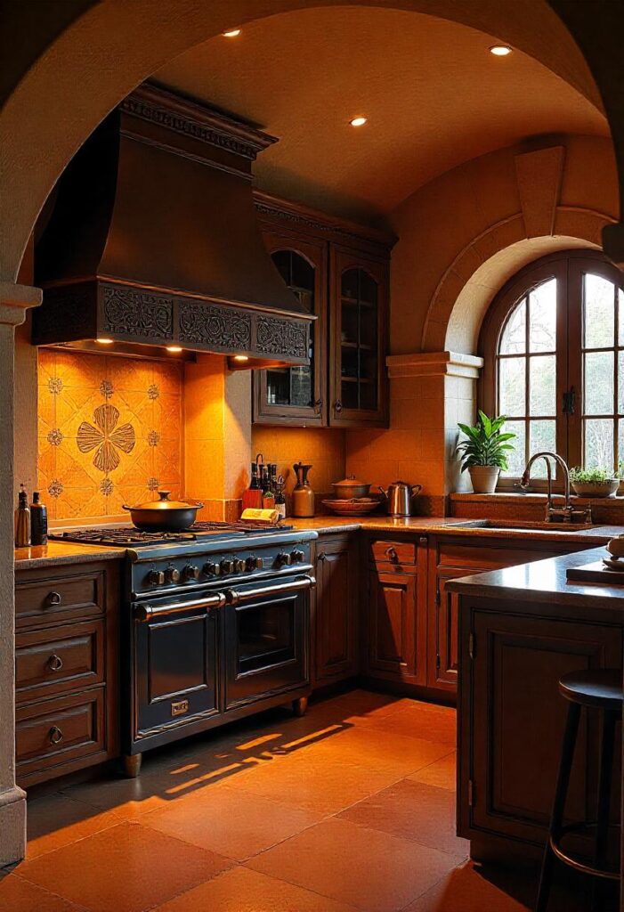 Intricate mosaic tiles, brass fixtures, and golden-toned wood set the tone for this mystical kitchen. Vaulted arches and a central iron potbelly stove create a creative space, with soft ambient lighting complementing the historic aesthetic. The unique blend of tradition and creativity makes this kitchen an inspiring space for culinary exploration.