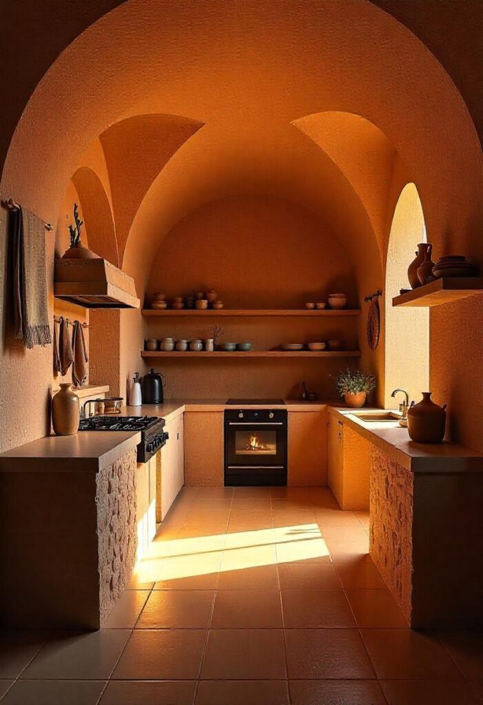 Terracotta walls, leather seating, and wooden beams evoke the warmth of the African savanna. A large stone hearth serves as the central cooking area, and natural light pours in through wide windows, offering an open atmosphere.