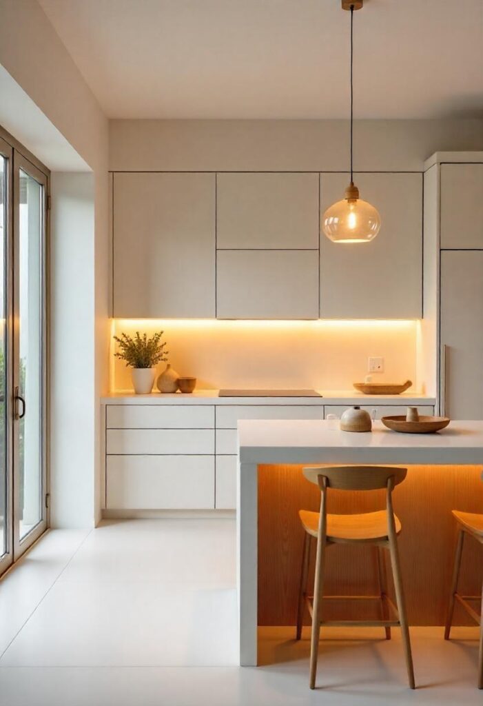 White stone countertops and frosted glass shelves reflect the purity of the Arctic, with snow-dusted wooden furniture adding warmth. Ambient lighting mimics the glow of the northern lights, creating a serene environment. The tranquil and minimalist design offers both serenity, bringing an almost otherworldly sense of calm to the home.