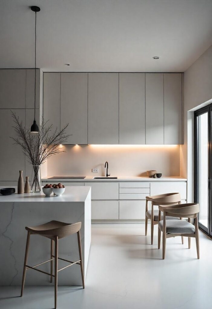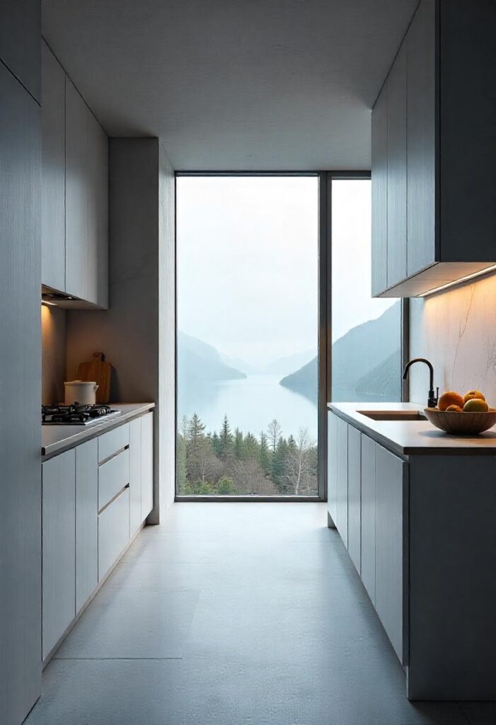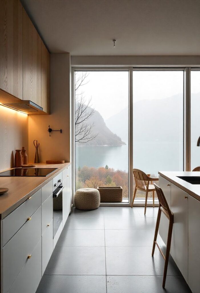 Grey stone floors and wooden countertops create a minimalist, calm environment, with large windows providing stunning views of nature. Subtle lighting enhances the peaceful and quiet atmosphere. This design connects with nature, creating a tranquil and functional space for daily living, bringing a refreshing sense of calm and balance to your home.