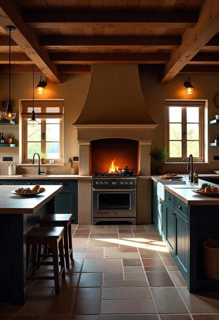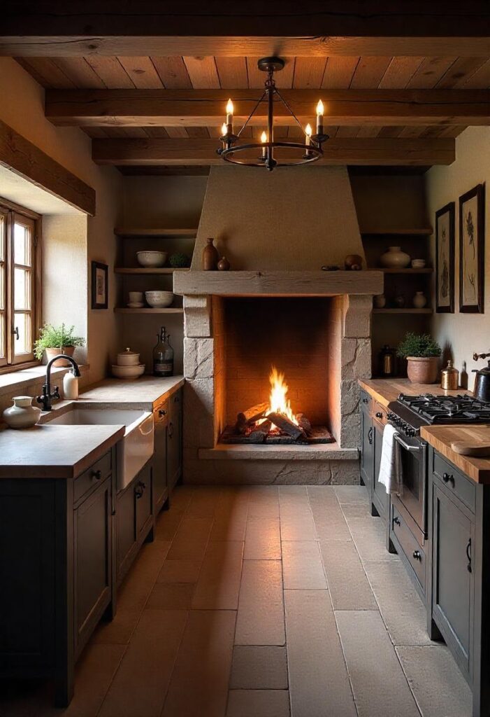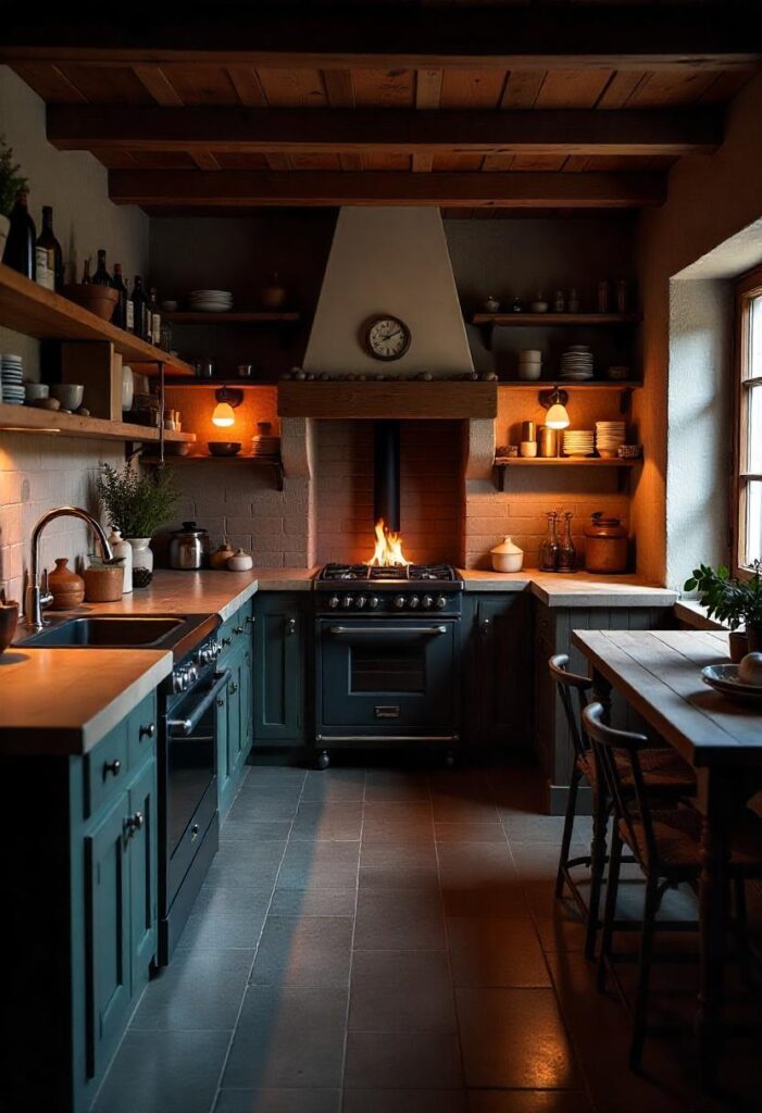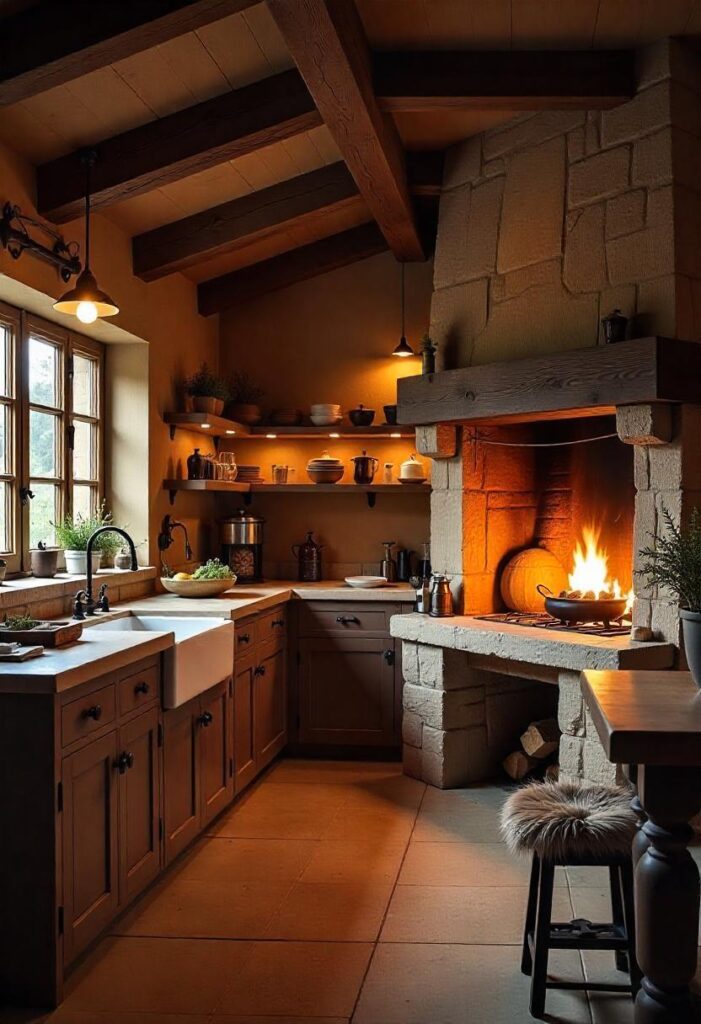 Reclaimed timber and stone countertops create a sturdy, earthy feel, with a large wood-burning stove and fur-lined benches providing warmth and comfort. Dim lighting and exposed beams enhance the intimate atmosphere. This design brings comfort, making it ideal for cozy family meals and practical living in any climate.