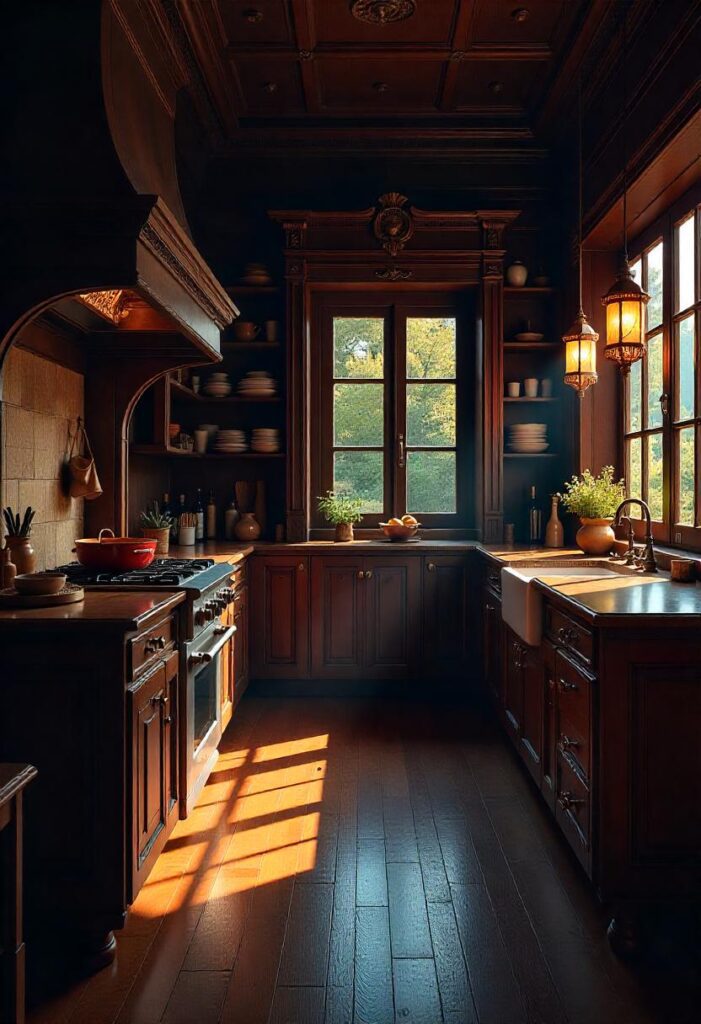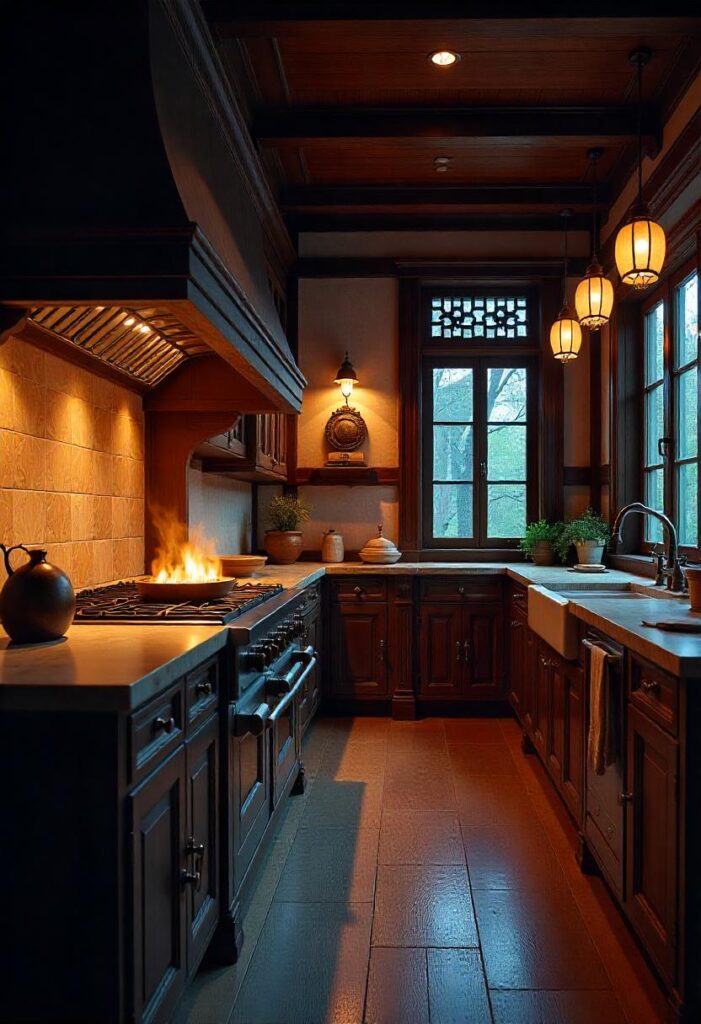 Dark wood paneling and hand-carved cabinetry create a peaceful, spiritual space, with a central wooden worktable, clay finishes, and ambient lighting evoking the tranquility of a Tibetan monastery. Simple, functional furnishings complete the calming environment. The serene beauty of this style offers a peaceful atmosphere for mindful cooking and living.