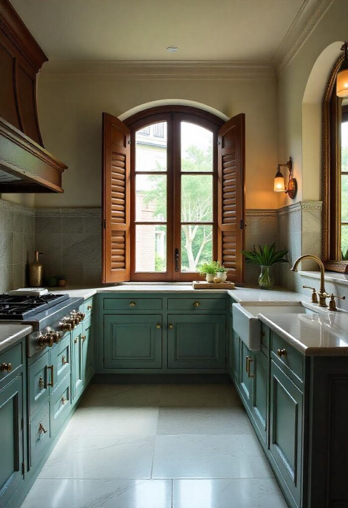 Marble countertops and Venetian-style wooden shutters create an elegant, coastal atmosphere, while brass fixtures and glass lighting add luxury. Cool-toned accents reflect the calm of the Venetian lagoon, and the room is bright and airy, ideal for both relaxing and cooking. This timeless style brings elegance, enhancing both the function and aesthetic appeal of your kitchen with a Mediterranean touch.