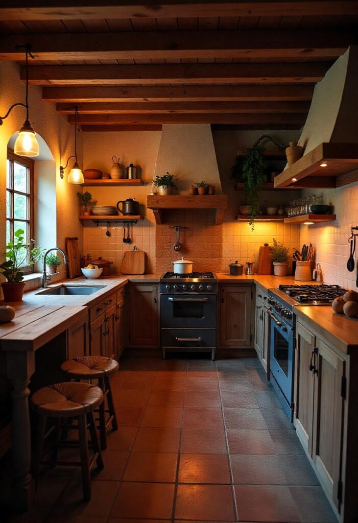 Reclaimed wood and stone surfaces evoke the Scottish highlands, with a central wood-burning stove providing warmth. Large windows bring in natural light and views of the landscape, and hand-carved furniture adds authenticity and warmth to the space. These type of kitchen creates a serene environment for those living in the house.