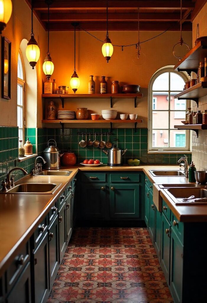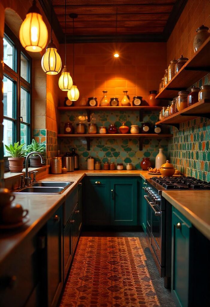 Copper sinks, patterned ceramic tiles, and brass fixtures bring the vibrant energy of a Persian bazaar into the kitchen. Rich velvet cushions and large rugs complement the luxurious feel, while artisanal shelves and a stone countertop offer practicality. This vibrant, colorful style creates a warm and lively atmosphere, ideal for those who enjoy bold aesthetics and cultural richness, bringing life and character to any home.