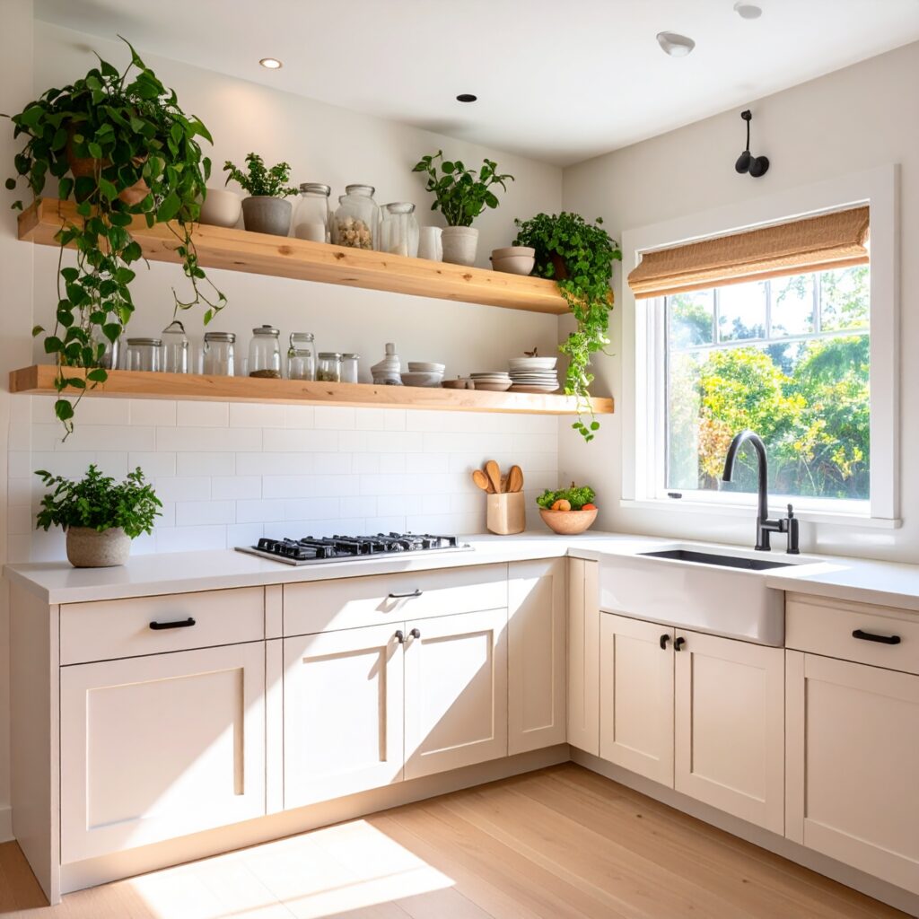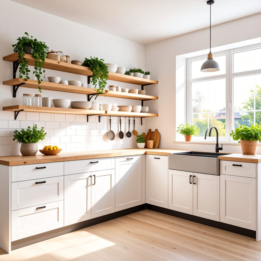 Open shelving is a modern design choice that replaces closed upper cabinets with exposed horizontal shelves. It visually opens up the kitchen, creating space especially in small apartments. This style encourages intentional display using everyday items like dishes, jars, and plants as part of the decor. Open shelving is perfect for those who appreciate minimalism without sacrificing expression.