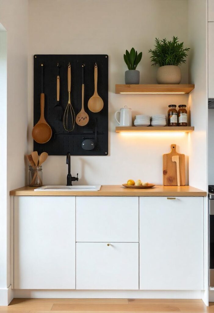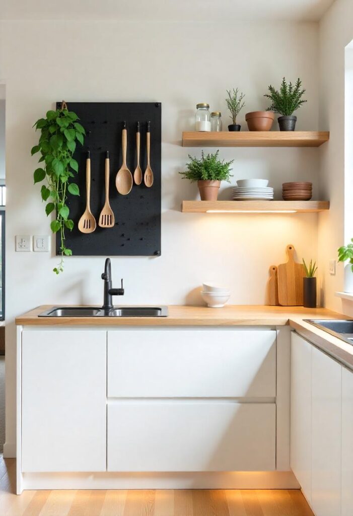 Vertical wall storage embraces the height of a kitchen to increase utility without crowding the floor. From pegboards and rail systems to floating shelves and herb gardens, it turns unused wall space into functional beauty. This style is perfect for apartments where space is limited but creativity is not. It offers a curated feel while keeping tools within easy reach. It’s an ideal blend of utility, aesthetics, and clever spatial thinking.