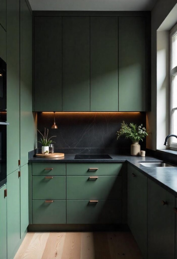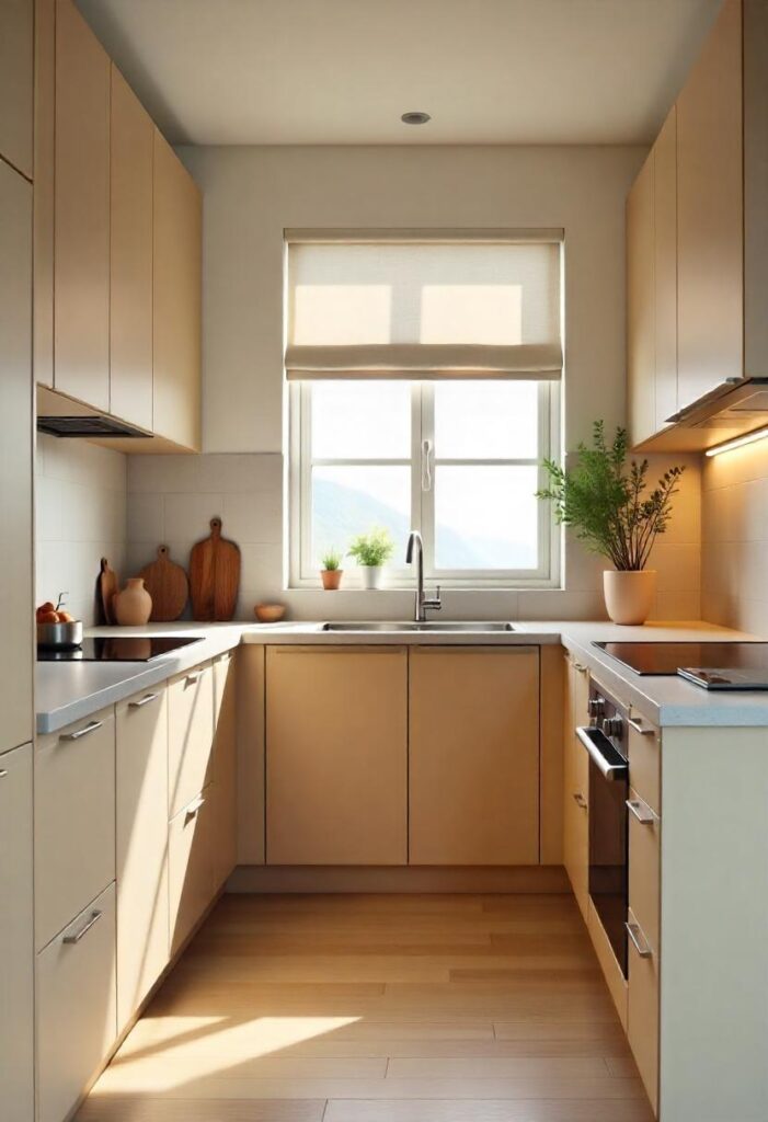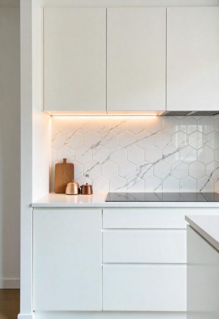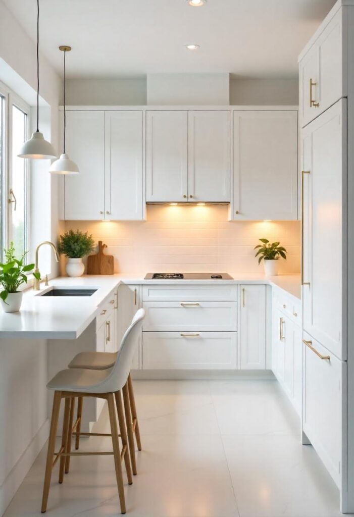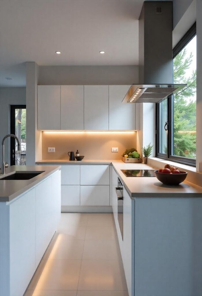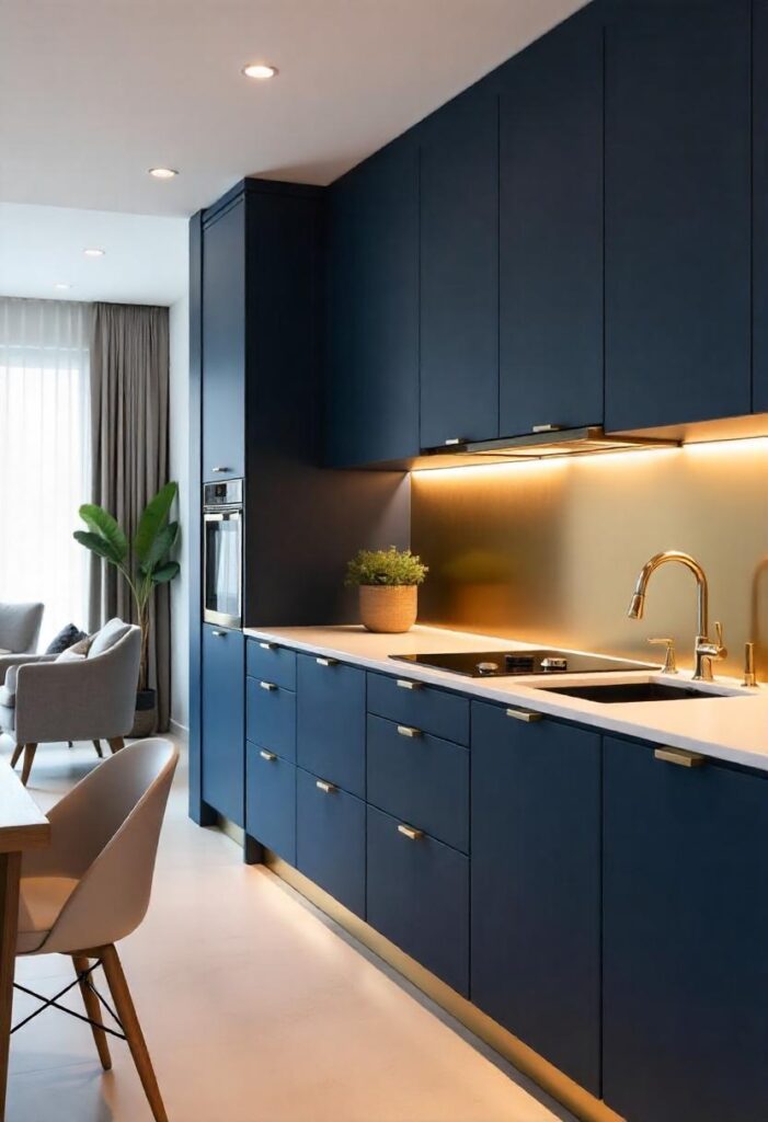 Under-cabinet lighting adds both form and function to a modern kitchen, illuminating work surfaces while enhancing ambiance. These hidden light strips or recessed fixtures highlight textures and create a warm, inviting glow in the evenings. Beyond practicality, they give depth and polish to the overall kitchen design. Whether warm-toned or cool LED, they bring cabinets and backsplashes to life. This lighting layer is an understated yet transformative upgrade for any modern apartment kitchen.