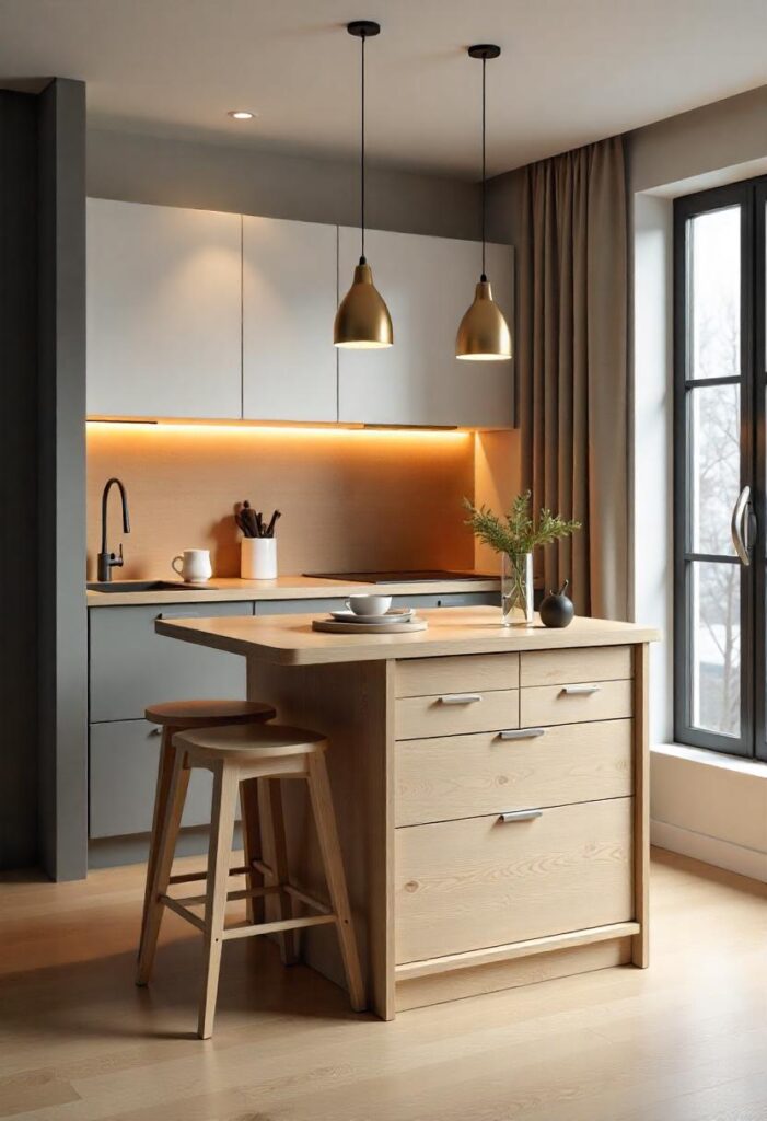 A compact kitchen island or movable cart adds multifunctionality without overwhelming limited space. It serves as a prep zone, storage hub, and casual dining spot all in one. These islands are typically slim, thoughtfully proportioned, and often mobile, perfect for apartment dwellers needing flexibility. The style blends practicality with style, offering drawer storage, shelving, or even fold-out surfaces. It’s a go-to solution for maximizing function in tight kitchens.