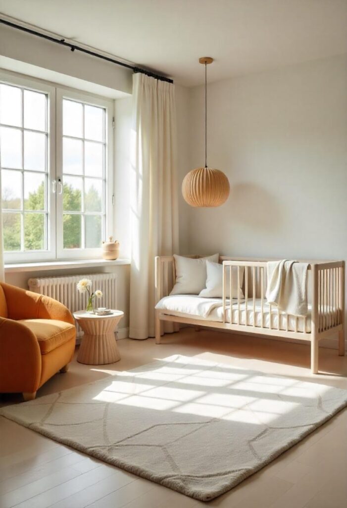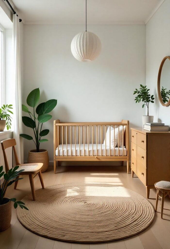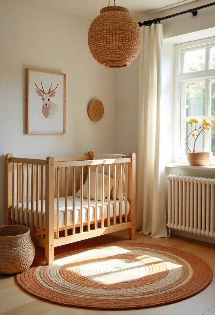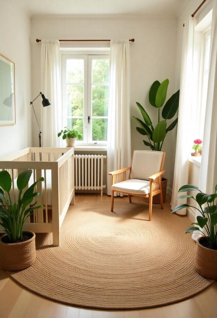 A jute rug brings an organic, earthy feel to the nursery. Available in shades of beige, tan, and natural fibers, jute rugs are both durable and stylish. They complement light wood furniture perfectly, enhancing the room’s natural theme. Jute also offers a unique texture that adds dimension to the space. While soft underfoot, it also holds up well to wear and tear, making it an ideal choice for high-traffic areas. Pair it with other natural elements like cotton or wool for a harmonious room.