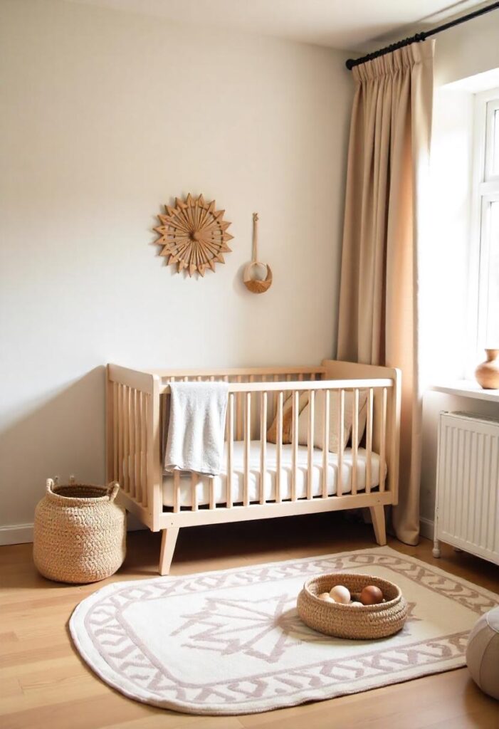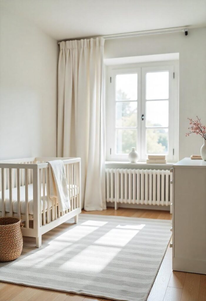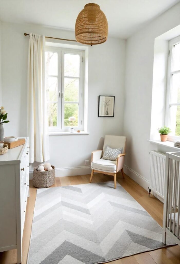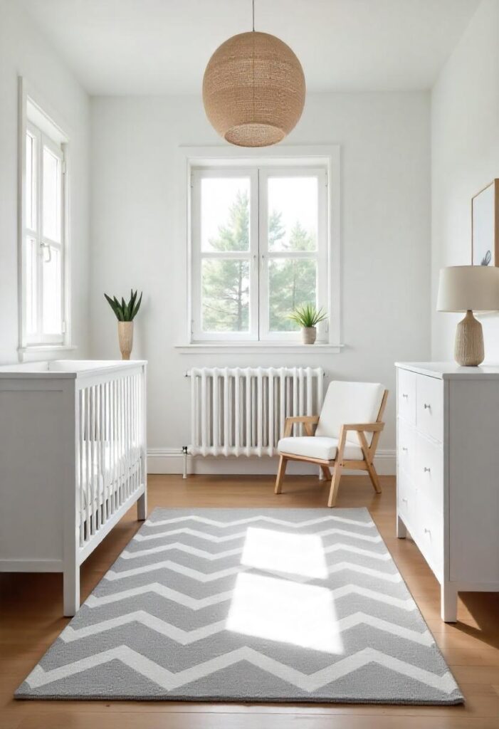 Chevron patterns offer a clean, crisp design that’s both modern and timeless. In neutral tones of grey and white, chevron rugs create an interesting focal point while staying within the theme of a neutral nursery. The V-shaped pattern adds rhythm and movement to the space, making it visually appealing without being overwhelming. Pair it with minimalist furniture and soft textiles for a harmonious look. Chevron rugs are easy to incorporate into almost any nursery style, from contemporary to traditional. The pattern’s balance of sharp lines and soft hues offers visual depth.