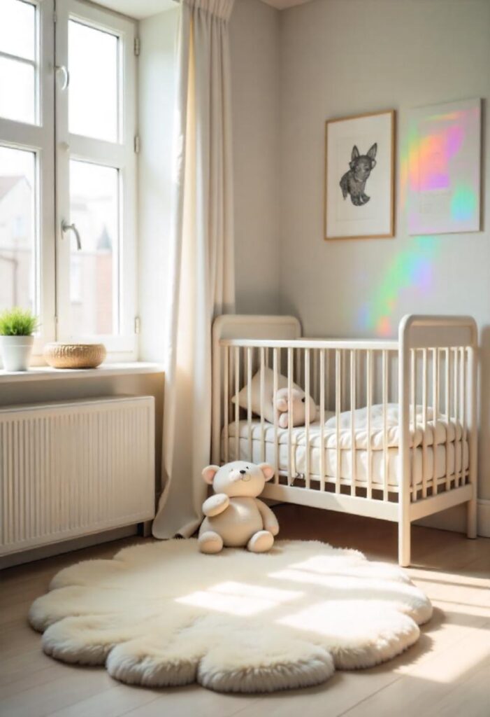 For ultimate comfort and softness, faux sheepskin rugs in neutral shades like cream or light grey are ideal. Their plush texture makes them perfect for lounging, playtime, or simply adding warmth to the nursery. The neutral tones make it easy to coordinate with any other nursery elements. Faux sheepskin rugs also add a layer of luxury without the high maintenance of real sheepskin. Place one next to the crib for a soft area where your baby can rest or crawl. This style works well in both modern and traditional settings, providing a versatile and cozy touch.