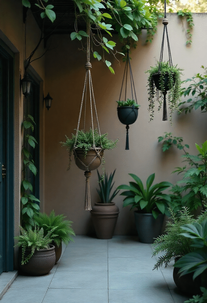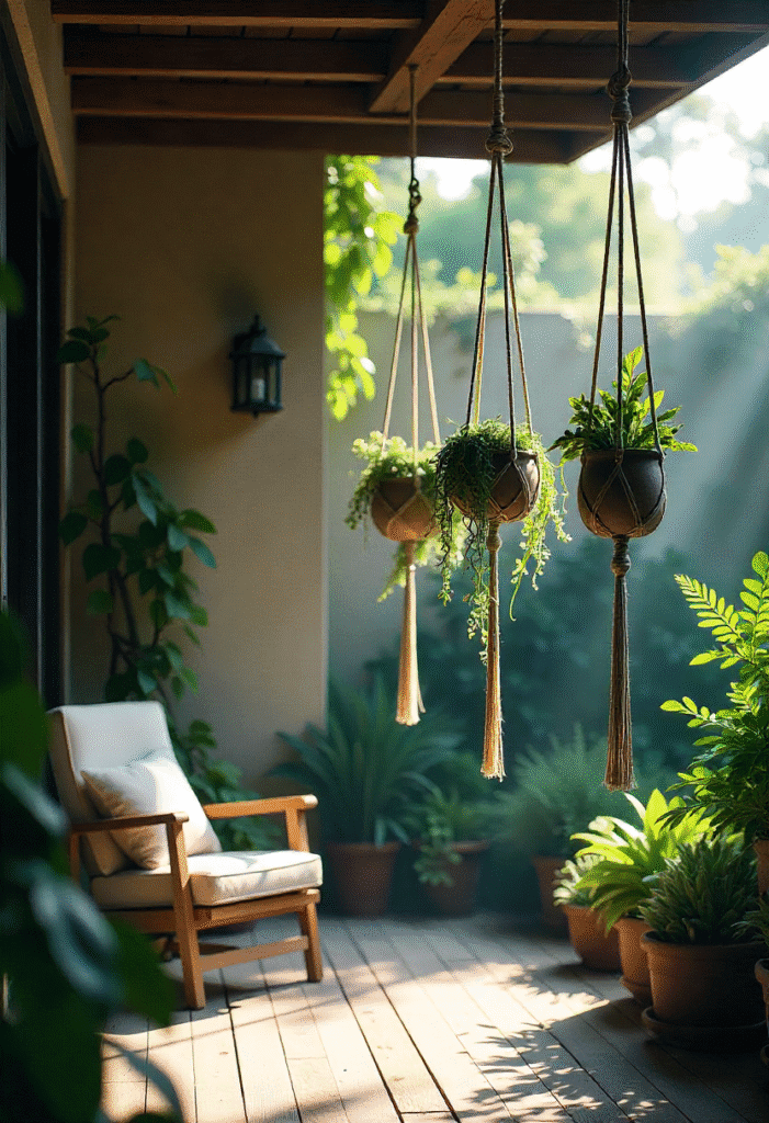 Macramé planters are a staple of boho decor. Hanging a few of these intricate plant holders around your patio can add depth, texture, and greenery. Opt for different sizes and place them in strategic areas—perhaps near the edges of your patio or hanging from the ceiling above a seating area. Fill them with low-maintenance plants like ivy, ferns, or succulents to enhance the boho vibe. This simple addition instantly elevates the natural, organic feel of the space.