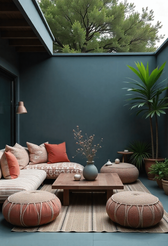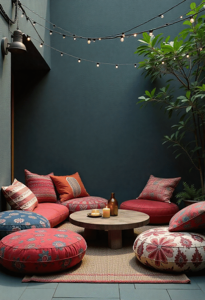 No boho patio is complete without floor cushions and poufs. These versatile pieces can be used as additional seating or simply to add a pop of color. Choose cushions in bold patterns like tribal prints, geometric shapes, or vibrant florals. Place them around a central coffee table or scatter them across the floor for a laid-back, lounge-like atmosphere. The key to a boho patio is layering textures and colors—so don’t be afraid to mix and match!