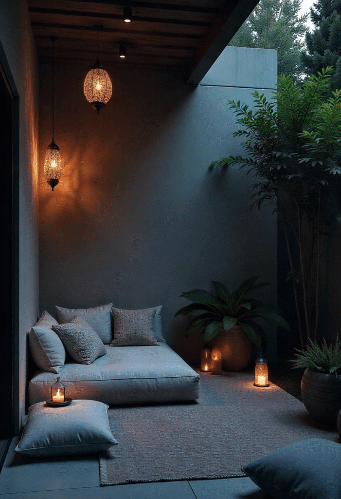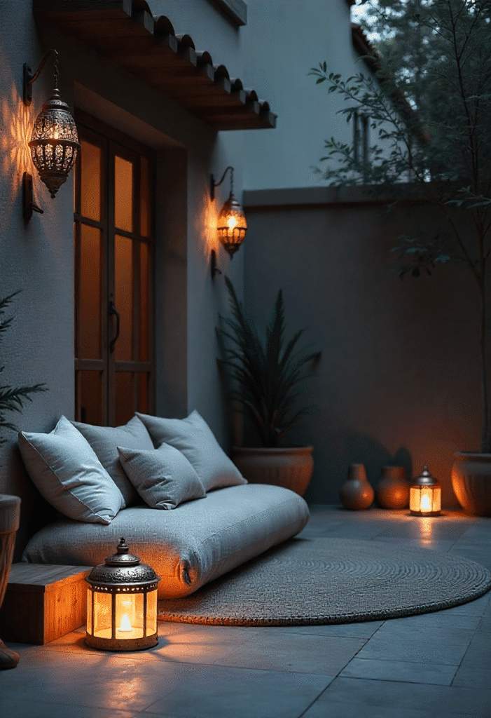 Lighting plays a huge role in setting the mood on a boho patio. Moroccan-inspired lanterns, with their intricate designs and warm glow, are perfect for adding both charm and a sense of mystique to your outdoor space. Hang a few lanterns from the ceiling or place them on the floor around your seating area. Their soft light creates a magical, inviting atmosphere as the sun sets and the evening begins.