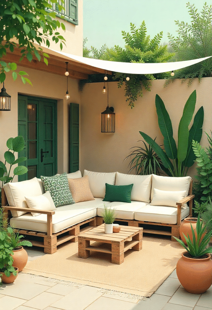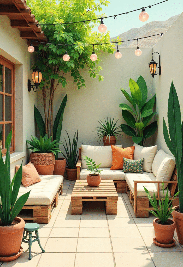 Repurposed wooden pallets are a great way to create affordable and eco-friendly furniture for your boho patio. Stack them to form a low coffee table or use them as seating by adding cushions on top. You can even create a DIY daybed or lounge area with wooden pallets. The rustic, unfinished look of pallet furniture blends perfectly with boho decor, and it allows you to personalize your space with the addition of colorful throws and cushions.
