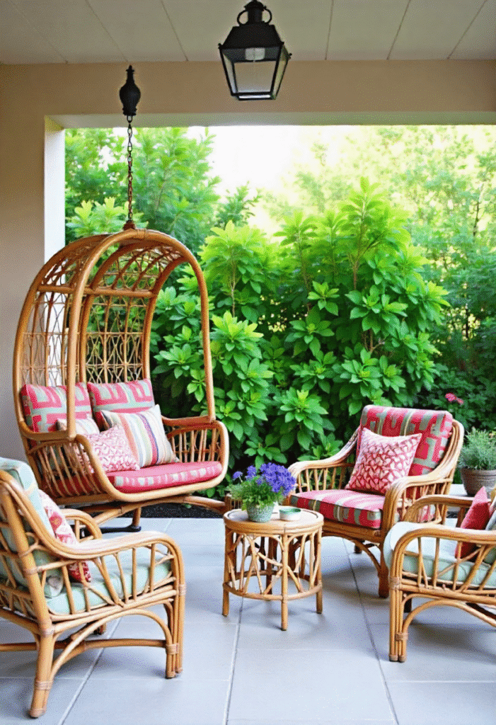 When it comes to boho patio furniture, rattan is the material of choice. Whether you choose a comfortable swing chair, a set of woven armchairs, or a rustic coffee table, rattan offers both style and functionality. Pair these pieces with colorful cushions in ethnic or vintage patterns to inject personality into your space. A well-placed throw blanket can also add warmth and comfort. For a complete boho look, surround the furniture with lush plants, natural wooden accents, and perhaps even a patterned rug.