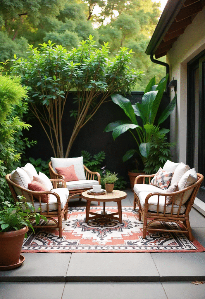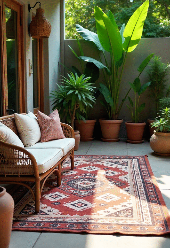 Add a touch of warmth and comfort to your patio with a patterned outdoor rug. Look for rugs that feature geometric, tribal, or vintage-inspired prints—anything that brings color and texture to the floor. Not only does a rug help define your seating area, but it also adds a sense of coziness to the patio. It’s an easy way to introduce more pattern into the space without overwhelming the design.