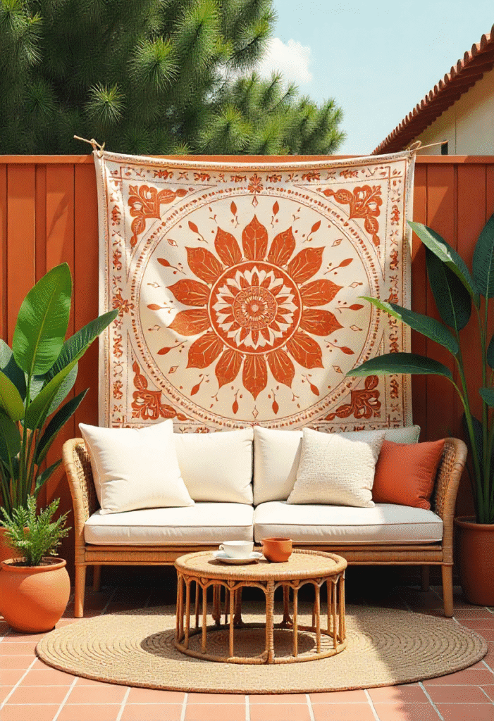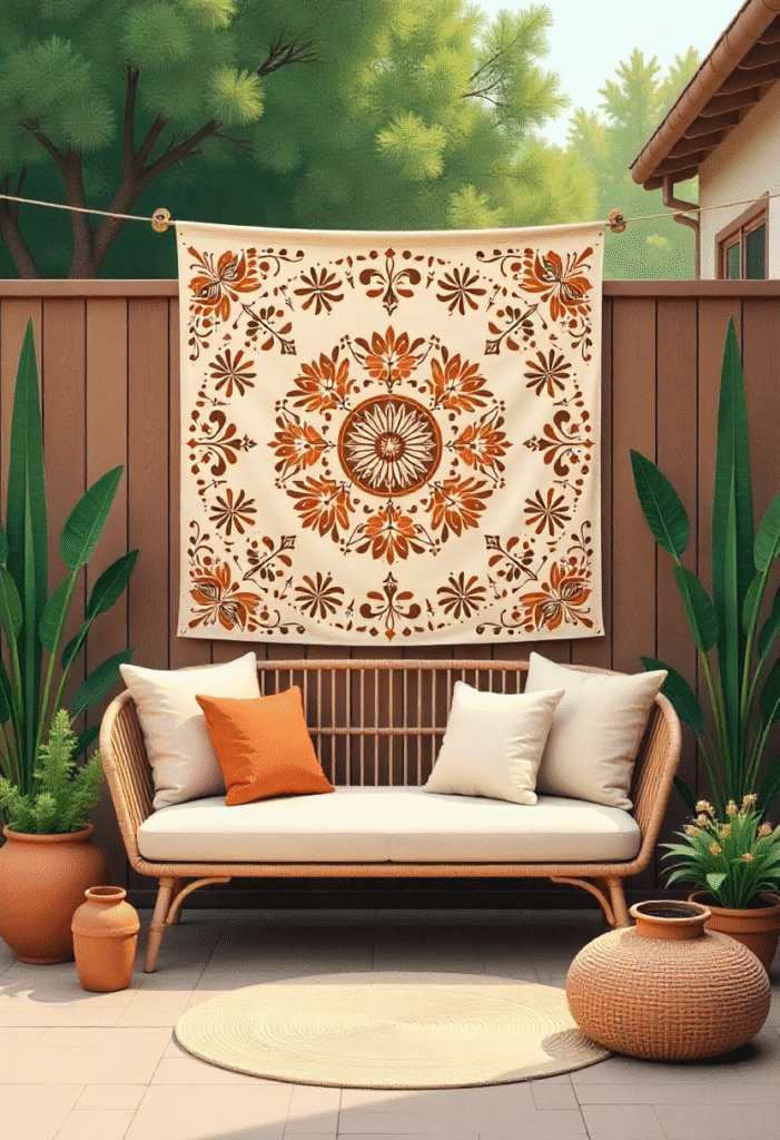 Vintage tapestries are a fantastic way to add color and texture to your patio. Hang one on the fence, wall, or even as a backdrop for your seating area. Look for tapestries with intricate patterns and earthy tones to complement the natural boho aesthetic. Tapestries not only serve as art pieces but also as functional decor—offering shade on hot days or an additional layer of texture to your patio walls.