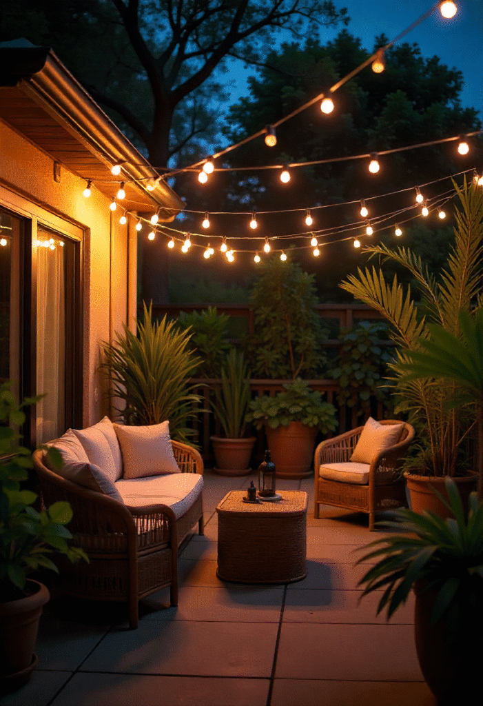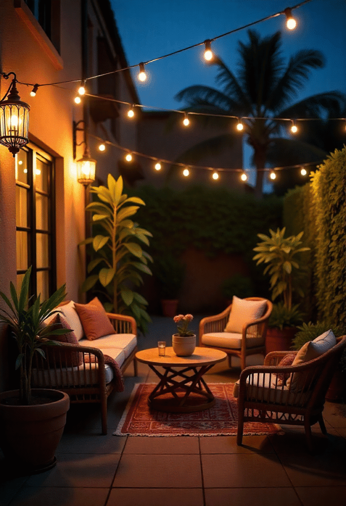 For a truly dreamy and whimsical touch, drape string lights or fairy lights around your patio. Whether you hang them from the edges of a pergola, along the fence, or across tree branches, these lights provide a soft, ambient glow that transforms the space after dark. Consider using solar-powered lights for a more eco-friendly option. The combination of lights and greenery creates a peaceful, bohemian retreat where you can relax under the stars.