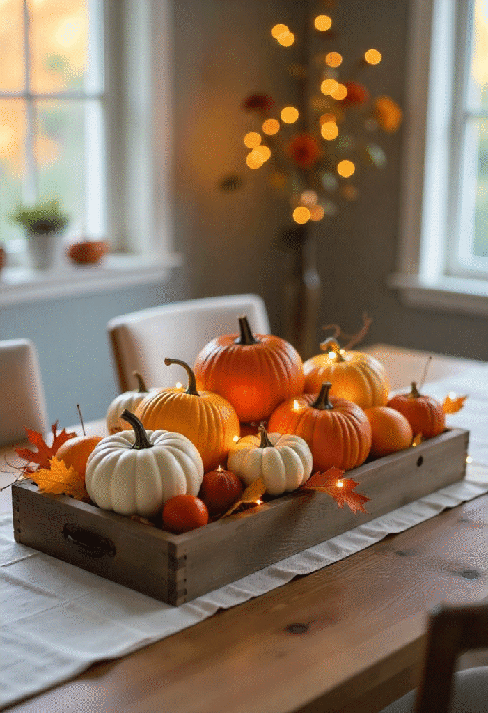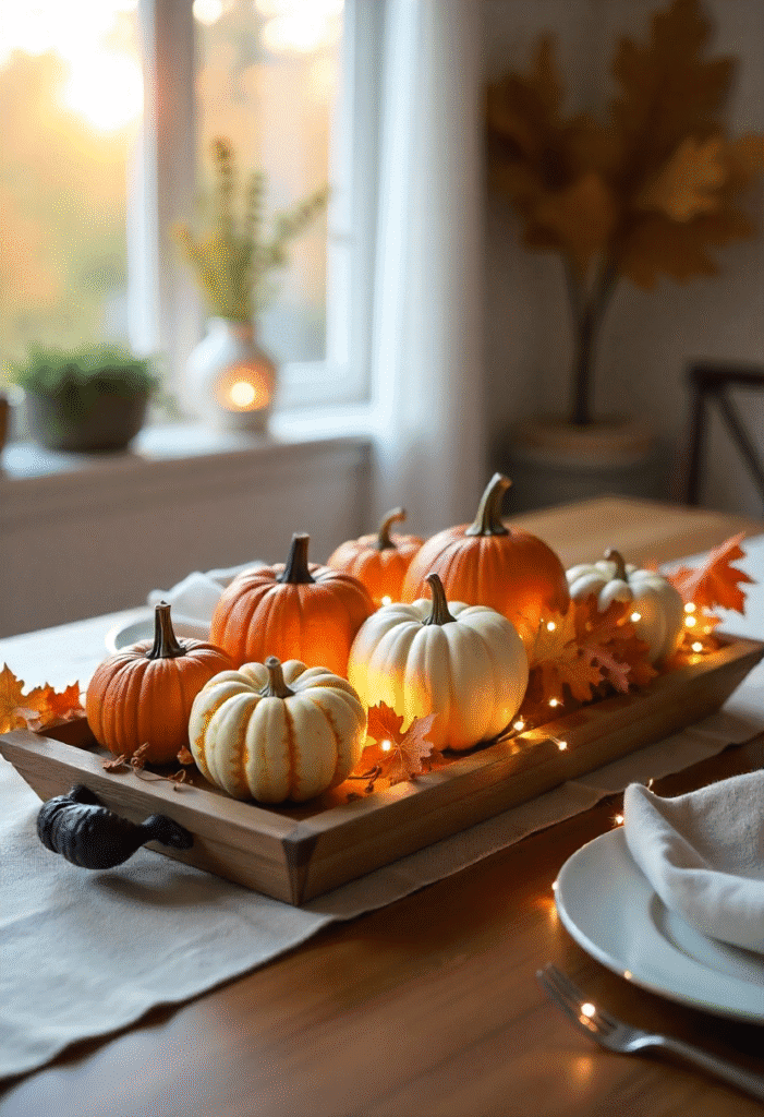 Pumpkins are the quintessential fall symbol, instantly evoking the season’s bounty and warmth. To create this look, use a rustic wooden tray or basket as a base for stability and texture. Arrange mini pumpkins, colorful gourds, dried corn husks, or acorns for variety. Add warm white fairy lights to create a cozy evening glow, perfect for gatherings. For variations, paint pumpkins in white or metallic gold for a modern twist, or choose heirloom varieties for unique shapes and colors. To maintain freshness, replace real pumpkins biweekly to prevent spoilage, or opt for faux ones for durability. This project can be completed within a budget of $20 to $50 at a pumpkin patch or craft store.