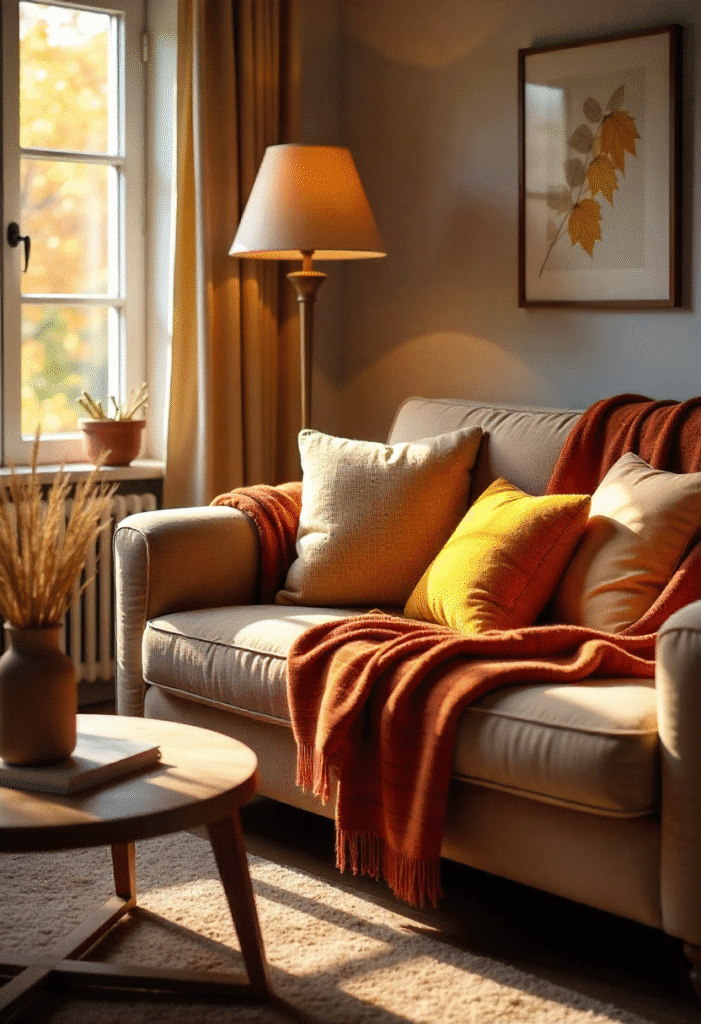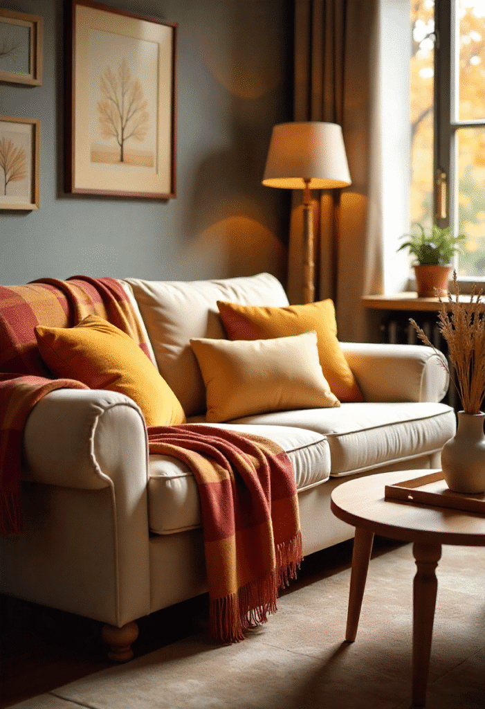 Textiles add warmth and comfort, making them perfect for fall’s cooler days. To create this cozy look, drape a plaid wool or fleece blanket over your sofa in colors like burnt orange, mustard yellow, or deep red. Mix pillow patterns, such as buffalo check with solid knits, for added visual interest. For variations, try velvet pillows for a touch of luxury or cable-knit throws for rustic charm. For budget-friendly options, check thrift stores, and wash items in cold water to preserve their colors. This project can be achieved within a budget of $25 to $60.