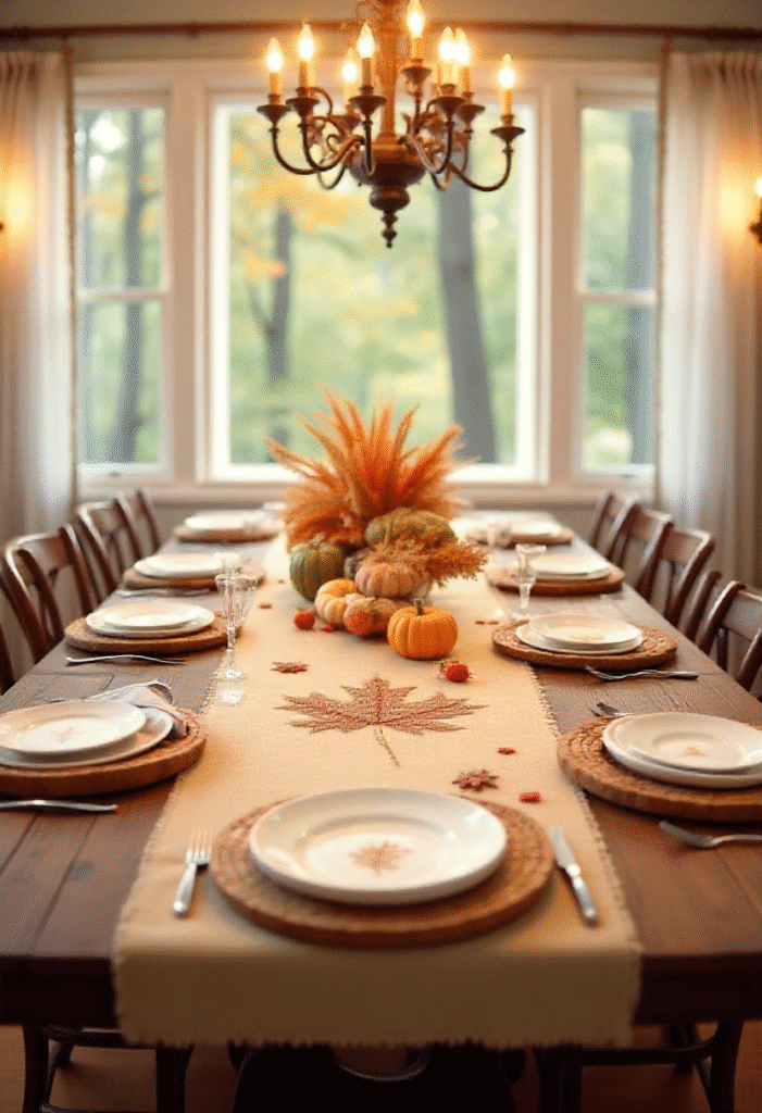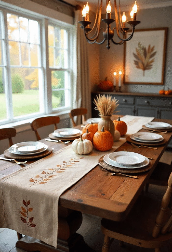 A runner sets a warm, communal tone for fall meals, making the dining experience feel inviting. To create this look, use a burlap or linen runner embroidered with leaves or acorns, and pair it with wooden chargers, neutral plates, and a centerpiece of candles or wheat bundles. For variations, stencil your own designs for a custom touch, or layer the runner over a white tablecloth for added elegance. Burlap is durable and washable, making it perfect for frequent use. This project can be achieved with a budget of $15 to $35.