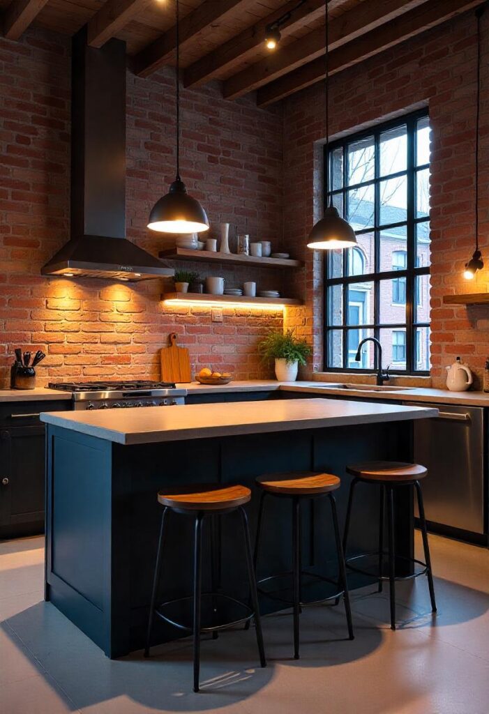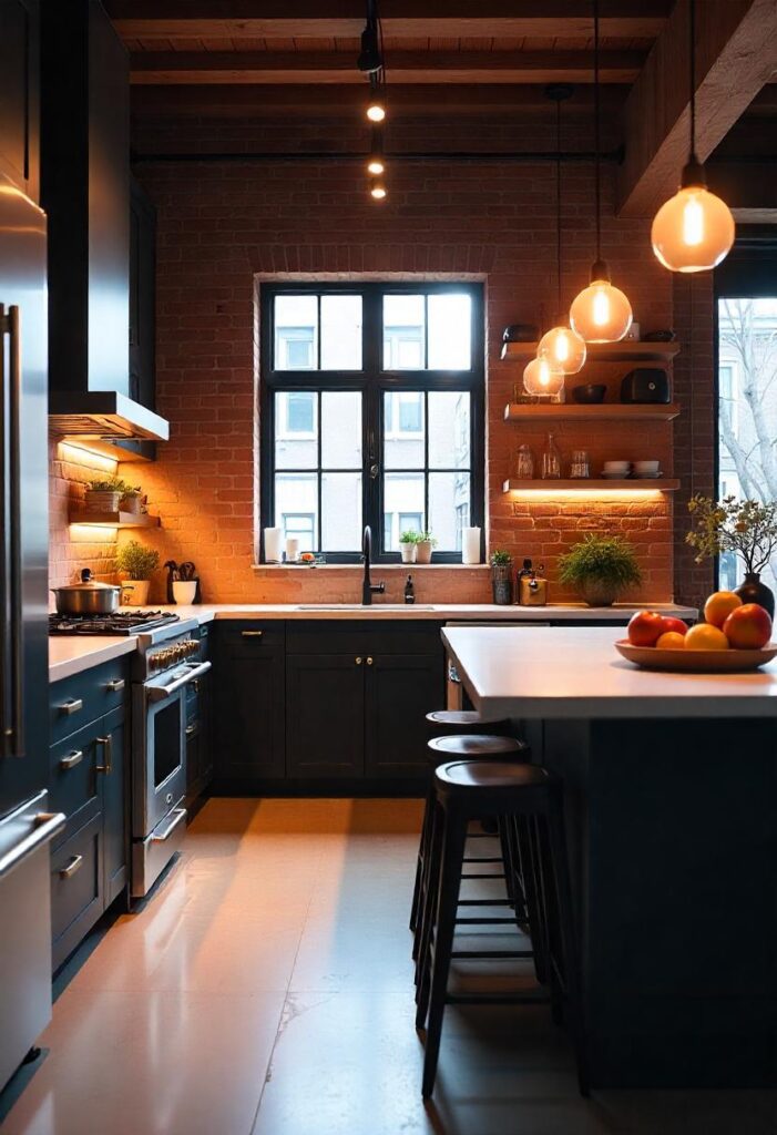 The Urban Loft Kitchen features exposed brick walls and steel appliances with open shelving. It has large windows that let natural light flood the space. Dark wooden accents on the island or counters add warmth to the industrial elements. The design combines a bold metropolitan aesthetic with a minimalistic and spacious feel. This kitchen style suits anyone who enjoys an urban, chic atmosphere.
