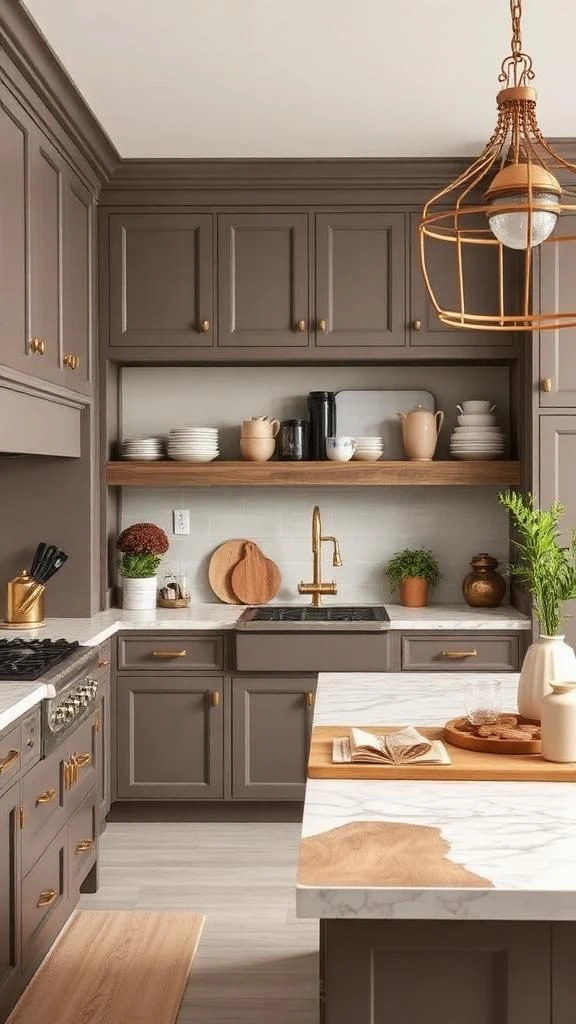 Modern Country Escape blends rustic and contemporary elements. Deep earthy tones like taupe and grey are paired with sleek appliances. A reclaimed wood island becomes the focal point of the kitchen. Marble countertops add luxury while open shelving and vintage lighting bring a rustic charm. This design creates a welcoming space that balances comfort with modern style.