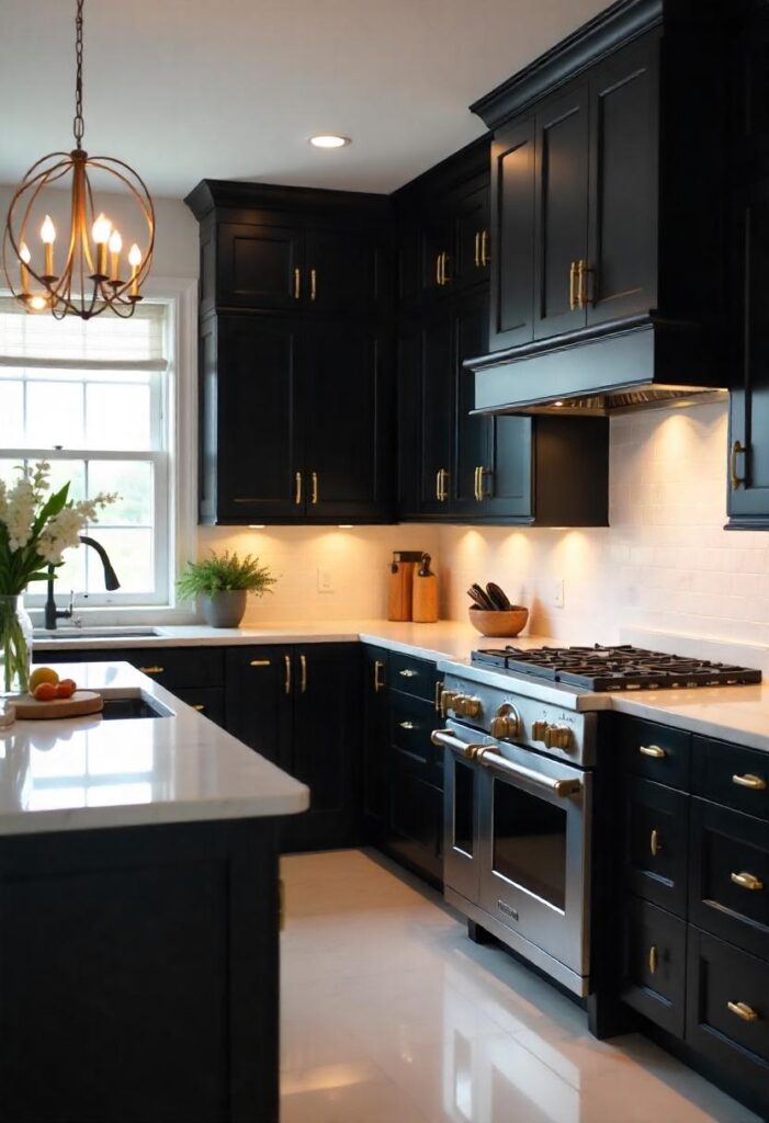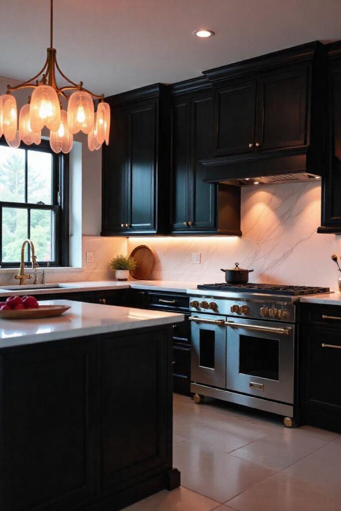 Glamour Meets Function creates a luxurious atmosphere with glossy black cabinetry and gold hardware. Marble countertops add sophistication while stainless steel appliances maintain practicality. A statement chandelier or pendant lights enhances the glamour of the space. This style is perfect for anyone who wants a kitchen that combines stunning beauty and functionality.