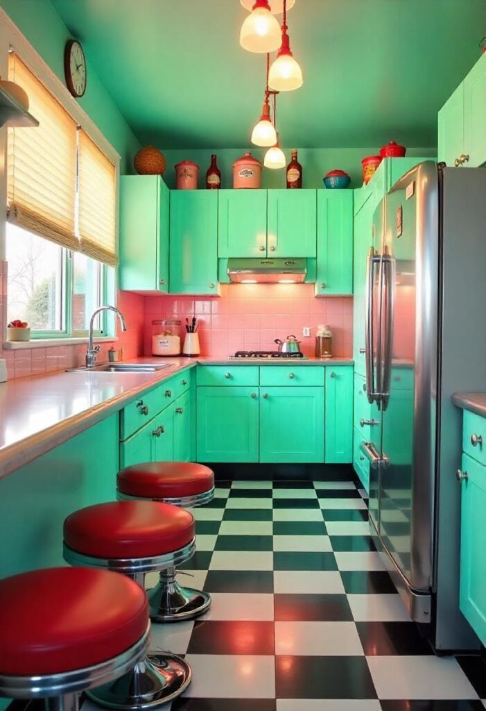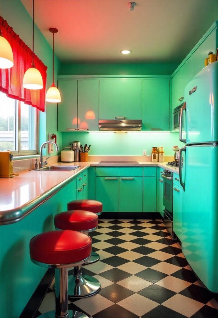 Retro Revival Diner brings a playful nostalgic feel to the kitchen. Bold colors like mint green and red dominate the cabinetry. Vintage diner stools and checkered floors add a fun touch. Stainless steel appliances offer a modern contrast while neon lights and retro signage create a lively atmosphere. This design is ideal for anyone who loves vintage charm and a bit of whimsy.