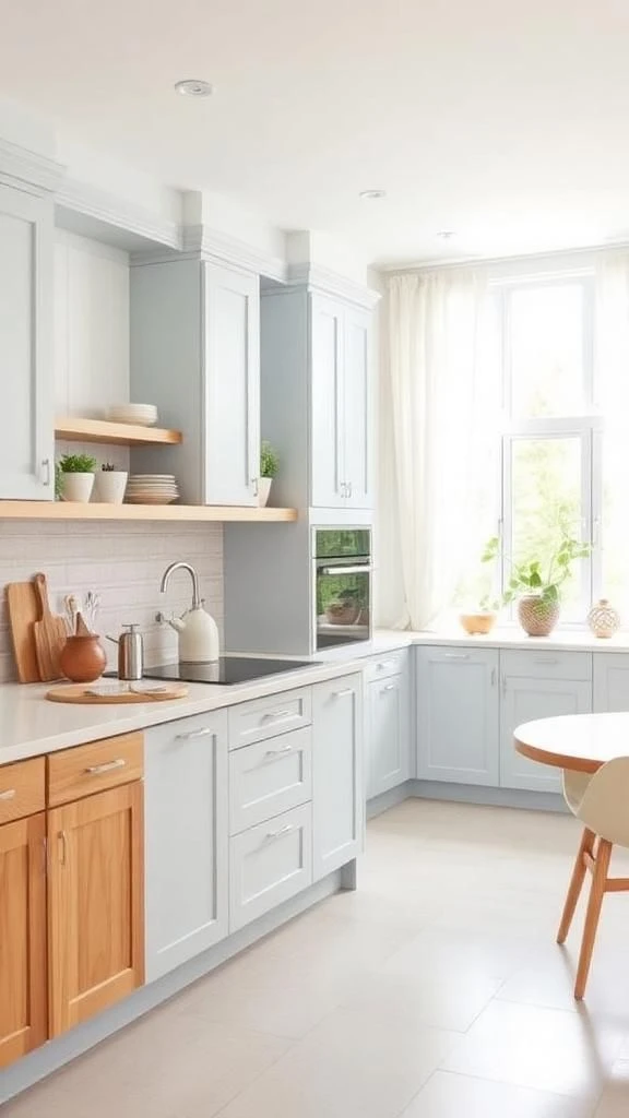 The Serene Sanctuary Kitchen offers a tranquil and balanced environment. Soft neutral tones and an airy layout create a peaceful feel. White and light blue cabinets make the space look fresh and open. Natural wood finishes add warmth and simple shelving keeps the space uncluttered. This design suits those who want a kitchen that fosters calm and relaxation.