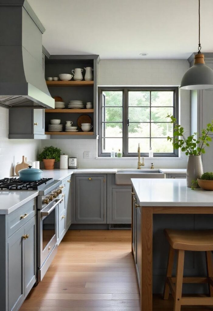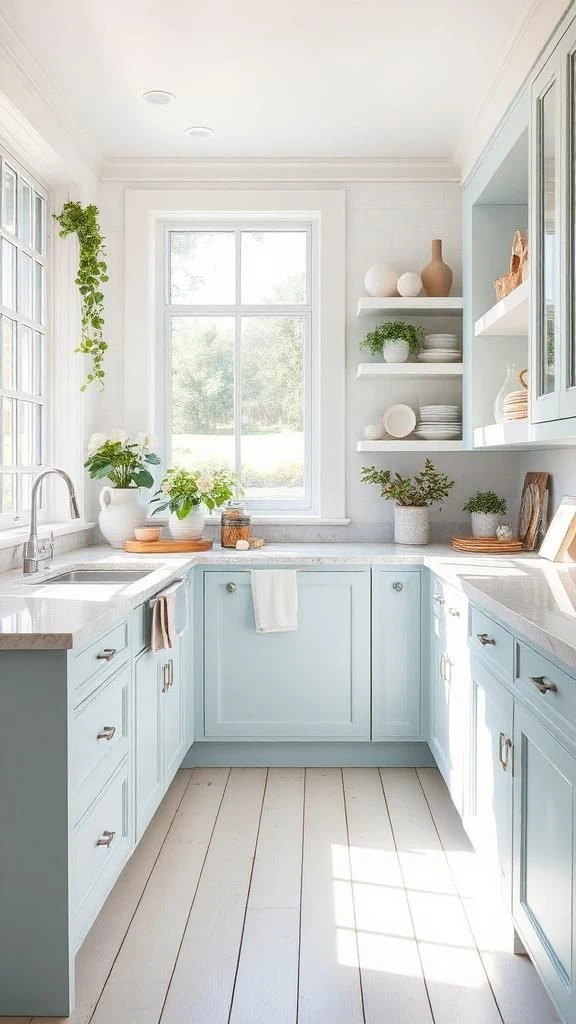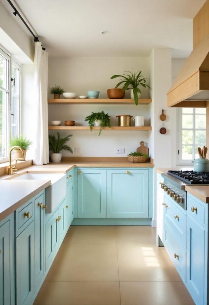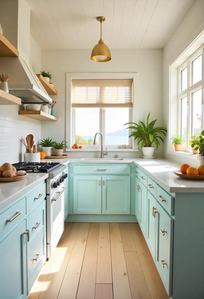 The Sunlit Seaside Kitchen uses soft hues like pale blue and white. Light wood accents create a calming and breezy atmosphere. Open shelving gives the space an airy feel. Vintage nautical decor adds a touch of seaside charm. This design is perfect for anyone seeking a peaceful kitchen that is bright and relaxing.