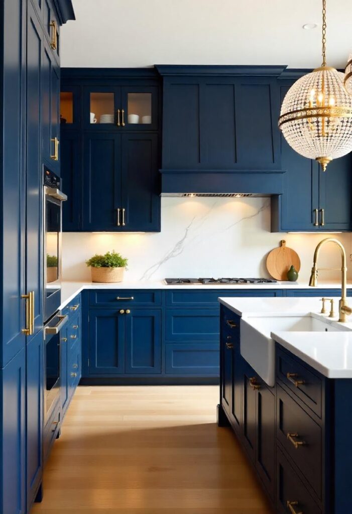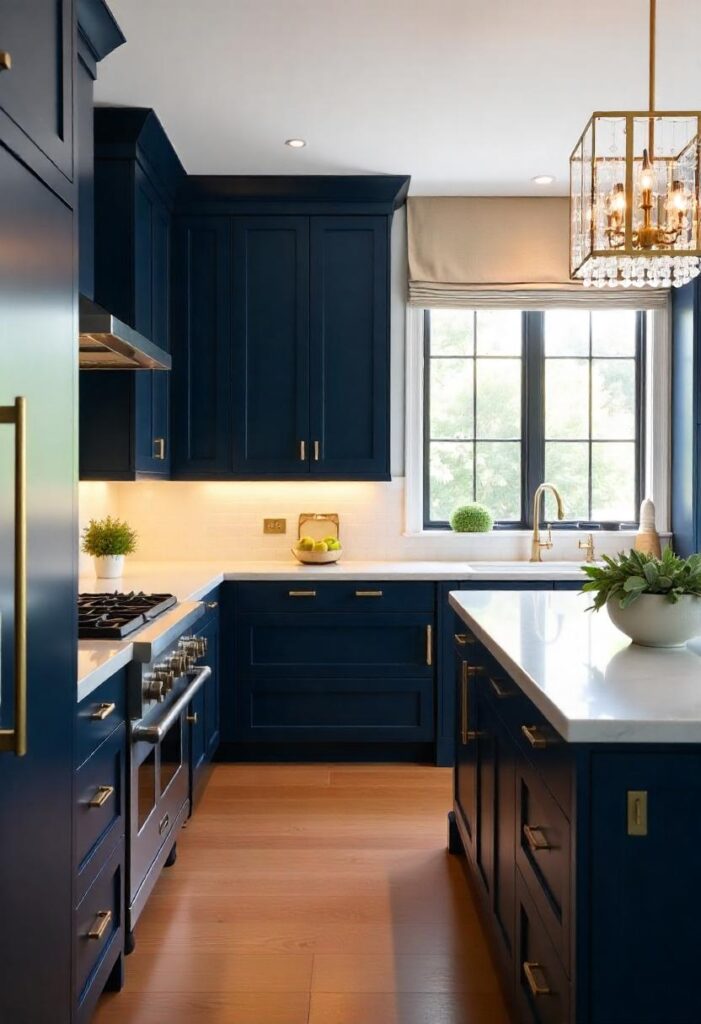 Timeless Elegance Kitchen exudes sophistication with deep navy cabinetry and gold accents. White marble countertops and a striking backsplash create a refined and beautiful look. Statement lighting such as chandeliers or crystal pendants add luxury to the space. This kitchen style is perfect for anyone who wants a classic and elegant design that lasts.