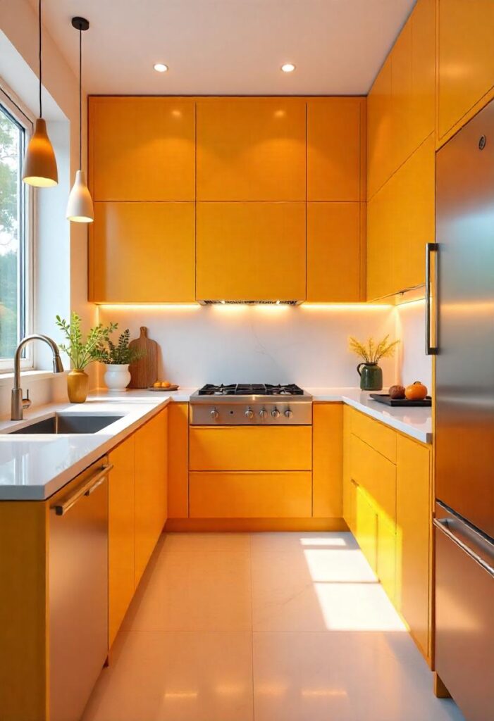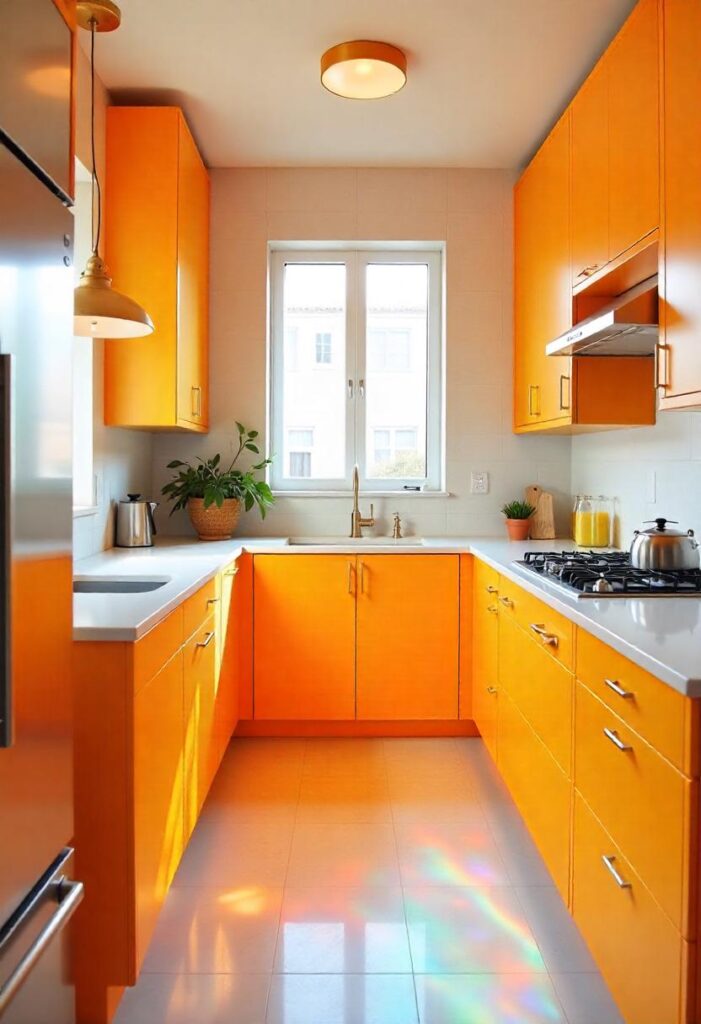 The Citrus Spice Kitchen is vibrant and full of energy. Bright orange, yellow, and green cabinets create a lively atmosphere. White countertops provide contrast while terracotta tiles add warmth and texture. Modern lighting fixtures brighten the space and add a fun twist. This design is perfect for anyone who enjoys bold colors and wants a kitchen full of life and excitement.