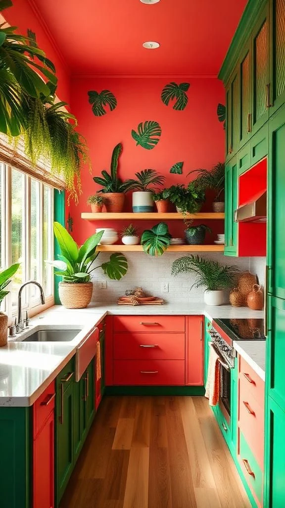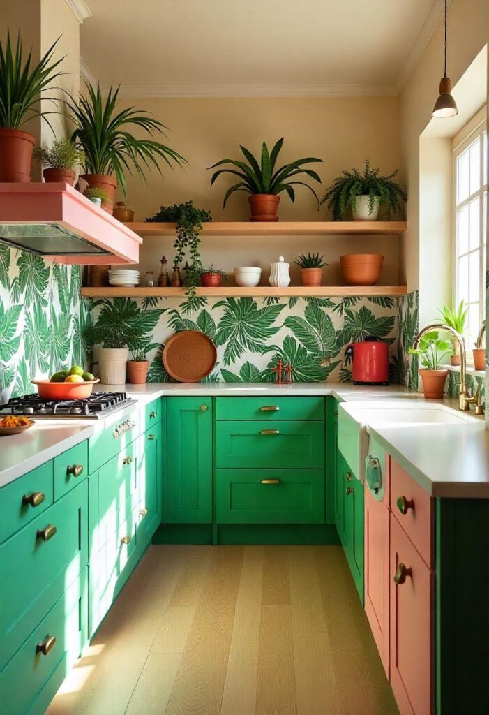 The Tropical Oasis Kitchen brings tropical warmth and charm into your home. Rich green and coral accents create a colorful and vibrant space. Natural wood finishes add a rustic touch while large windows and open shelving allow sunlight to fill the room. Tropical plants and bright decor enhance the tropical vibe. This kitchen style is ideal for anyone who wants to feel like they’re in a lush tropical paradise.