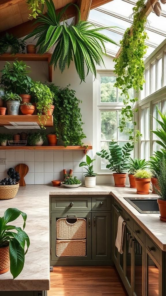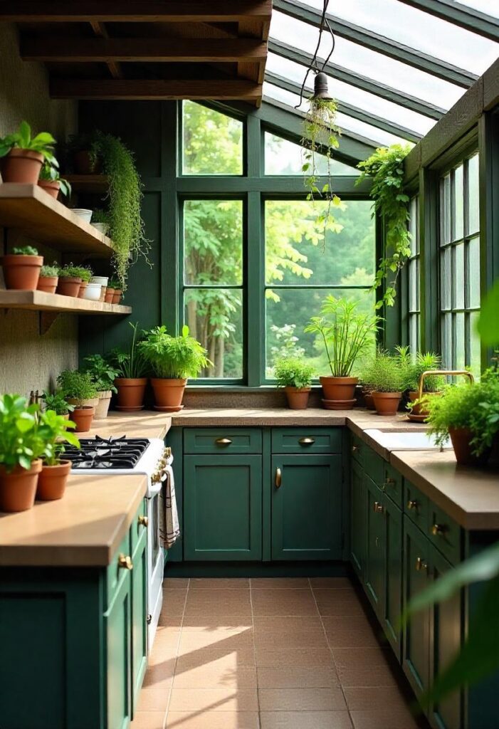 The Greenhouse Kitchen brings nature indoors with hanging plants and herb gardens. Terracotta pots and wooden shelving add warmth and character. Natural stone countertops enhance the earthy vibe. Large windows provide sunlight that makes the space feel fresh and lively. This kitchen is ideal for plant lovers who want a vibrant yet functional cooking area.