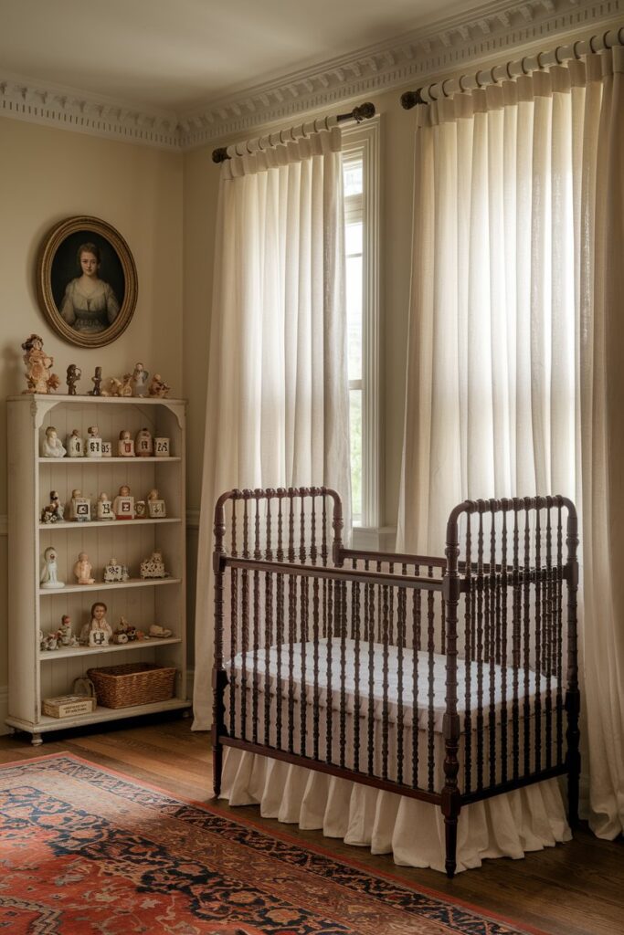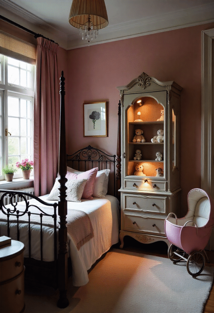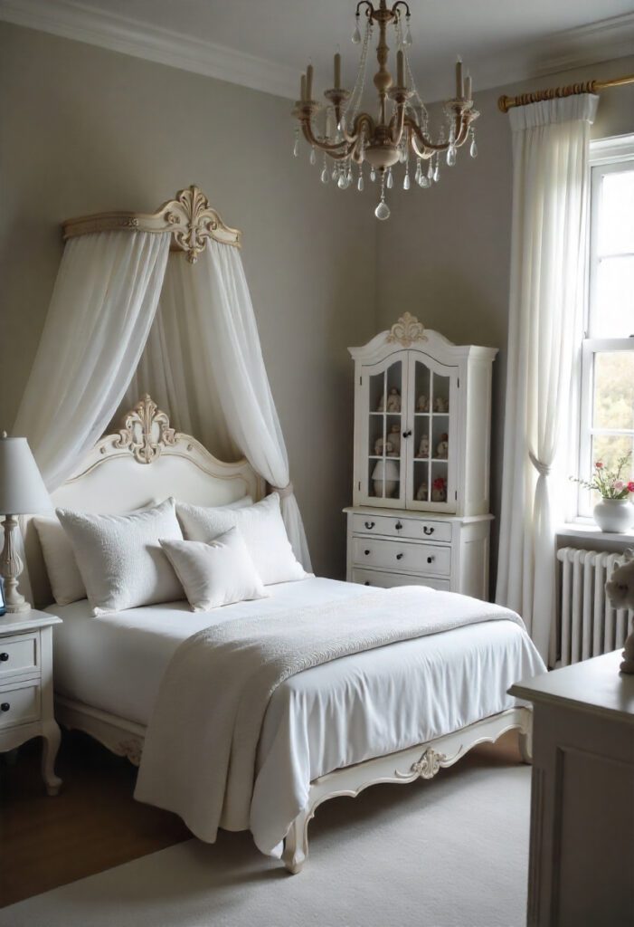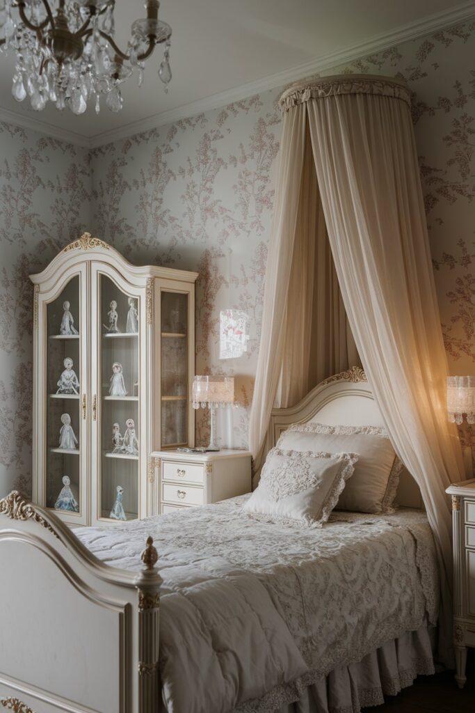 Inspired by French vintage styles, this room offers elegance with antique white furniture and gold accents. Pale grey walls complement lace-trimmed bedding and a tulle canopy over the bed. A chandelier casts a soft glow, while vintage glass cabinets display paper dolls and ribbons. The room exudes a sense of delicate luxury, perfect for a timeless nursery.
