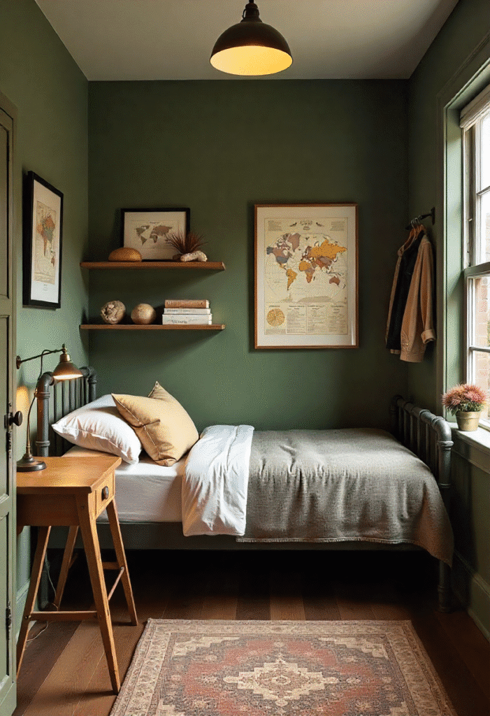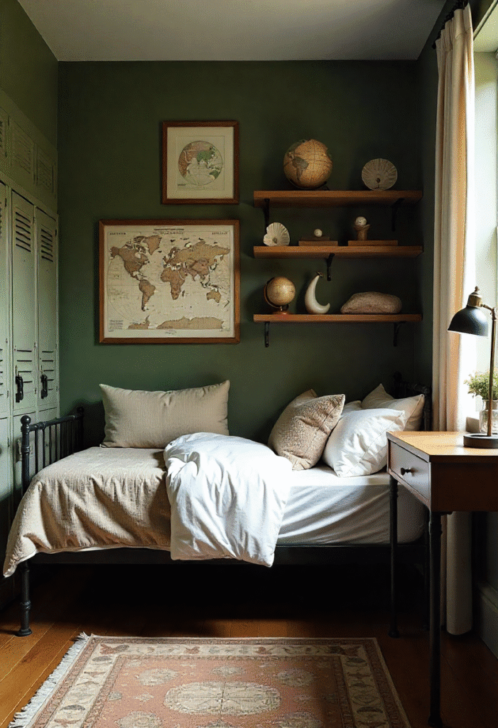 For a vintage twist on an academic theme, choose metal pipe bed frames and weathered school lockers. Olive green walls and a rolltop desk give the room an old-school charm. Framed maps and scientific charts add educational appeal. Shelves display globes and fossil collections. This style works well for a child with an intellectual curiosity, fostering both learning and play.