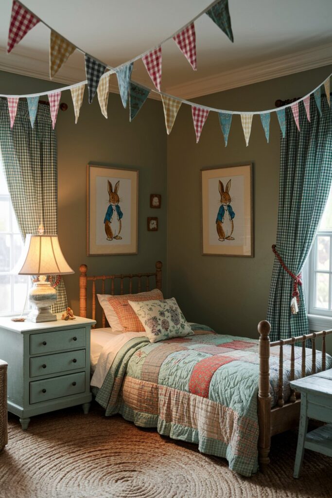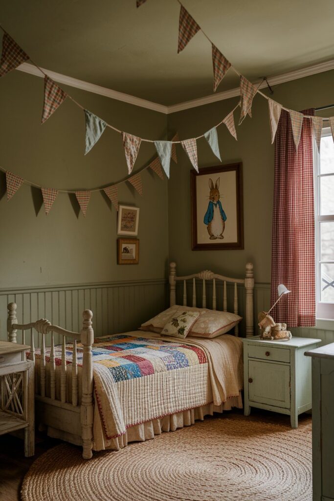 A 1940s-inspired storybook room brings charm and whimsy into a child’s space. Soft green walls serve as a gentle backdrop to hand-sewn bunting, patchwork quilts, and mismatched painted furniture. Framed storybook illustrations bring the room to life. A braided wool rug completes the look. This design invites a sense of warmth and imagination, perfect for young minds.