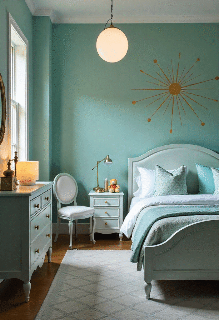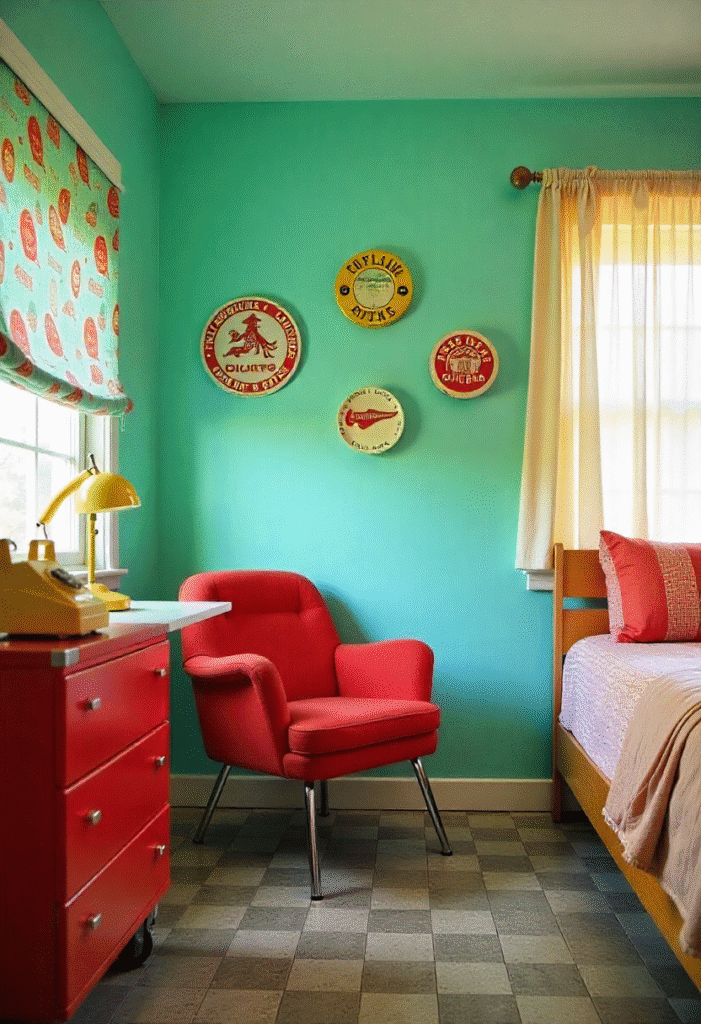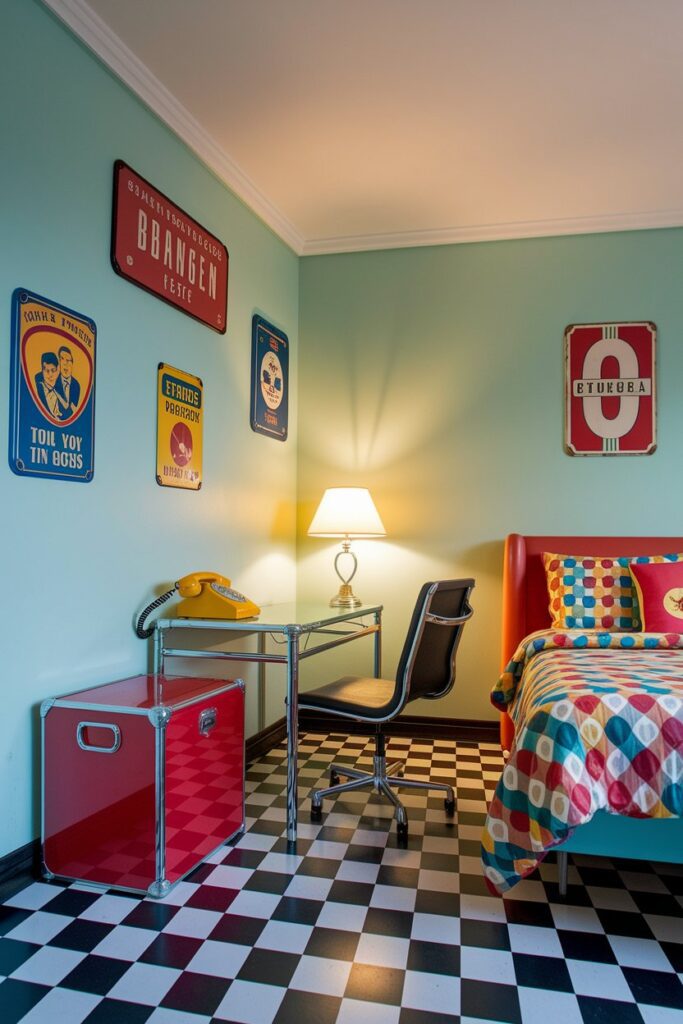 For a playful and vibrant vintage feel, a 1950s soda pop room uses bold colors and retro accents. Aqua walls, red toy boxes, and chrome furniture capture the essence of mid-century design. Classic diner-style chairs and a vintage rotary phone bring a nostalgic touch. Add some checkered flooring for a fun vibe. This room will surely be an energetic space for any child.