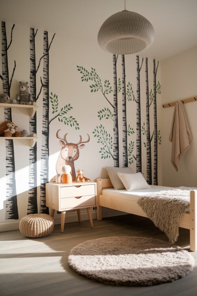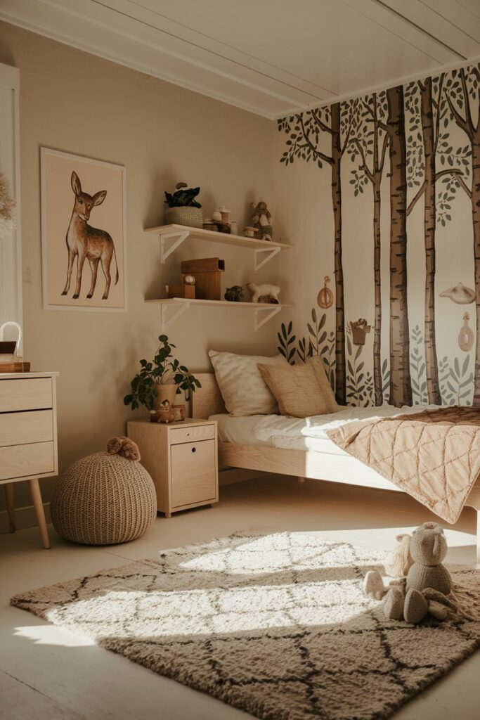 This design incorporates Scandinavian elements with a vintage twist, perfect for an earthy aesthetic. Pale birch wood furniture pairs seamlessly with soft wool rugs and a hand-painted animal mural. The walls are painted in neutral tones, allowing the furniture and artwork to shine. Small handmade toys on shelves add a touch of personality. It’s an ideal look for a calm yet creative environment.