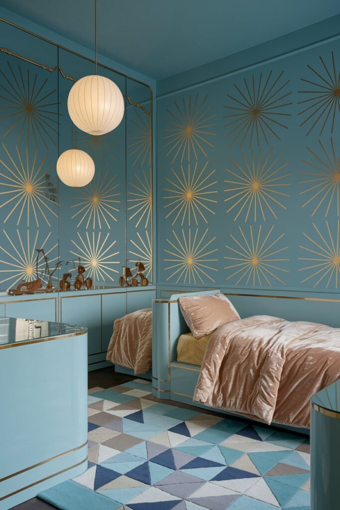 With Art Deco-inspired kids rooms, the emphasis is on geometric patterns and rich colors. Powder blue walls contrast with gold accents, while sleek lacquered furniture adds sophistication. Vintage toys are displayed in stylish cabinets. A geometric rug and mirrored lighting fixtures provide a playful yet chic atmosphere. This design combines glamour and childhood whimsy in one.