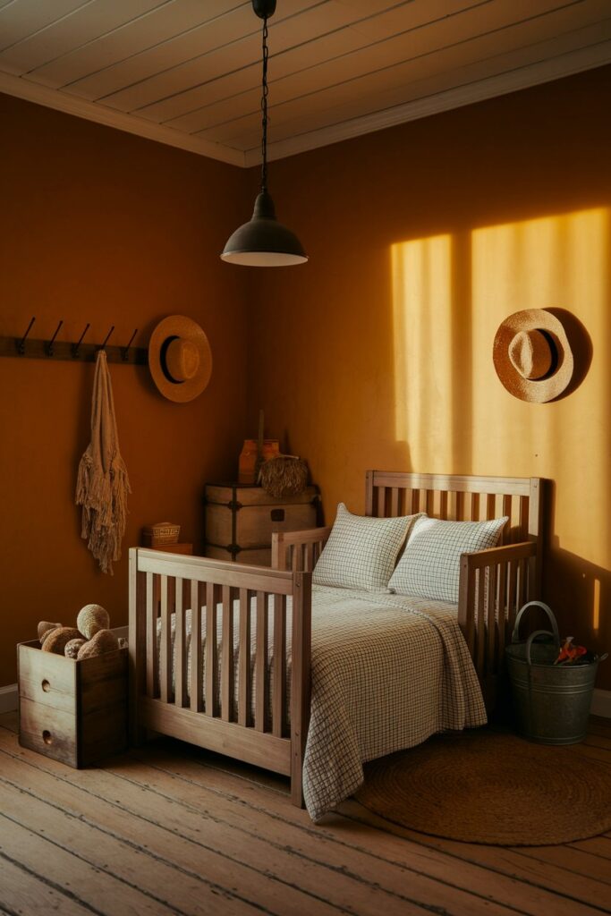 A vintage farmhouse room centers on simple, sturdy furniture like a slat wood bed and painted dressers. Hay yellow walls create a sunny and inviting space. Galvanized buckets serve as practical storage, while a barn-style light fixture adds character. Wooden floorboards ground the design. This vintage room is ideal for a down-to-earth atmosphere, inviting imagination without excess.