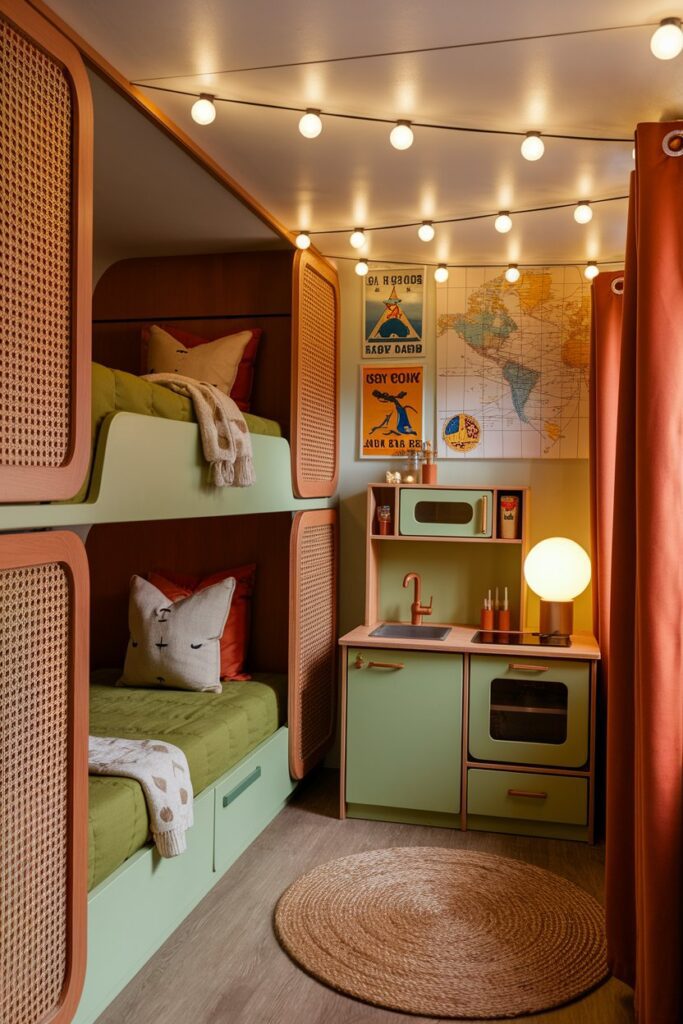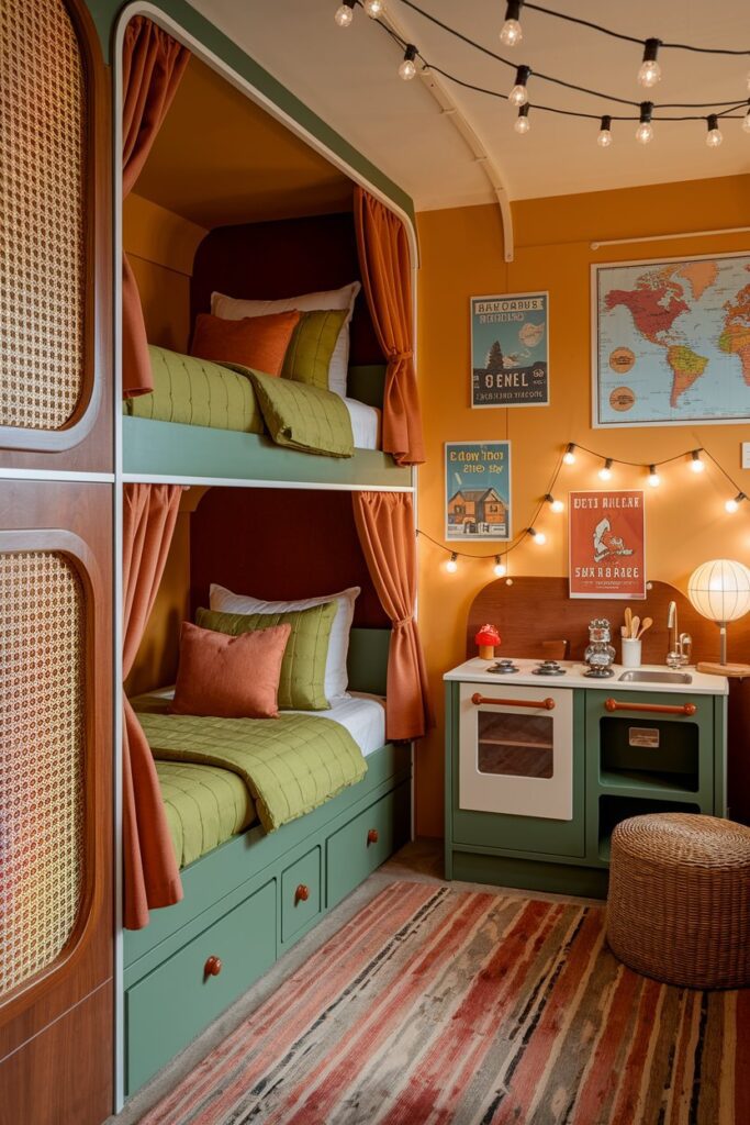 The retro camper room brings a sense of adventure with vintage travel-inspired elements. Paneling on the walls and bunk-style beds set the stage for a fun and playful atmosphere. Bold colors like avocado green and burnt orange make a statement. Maps, travel posters, and a globe add character to the room. It’s a space designed for exploration and creativity.